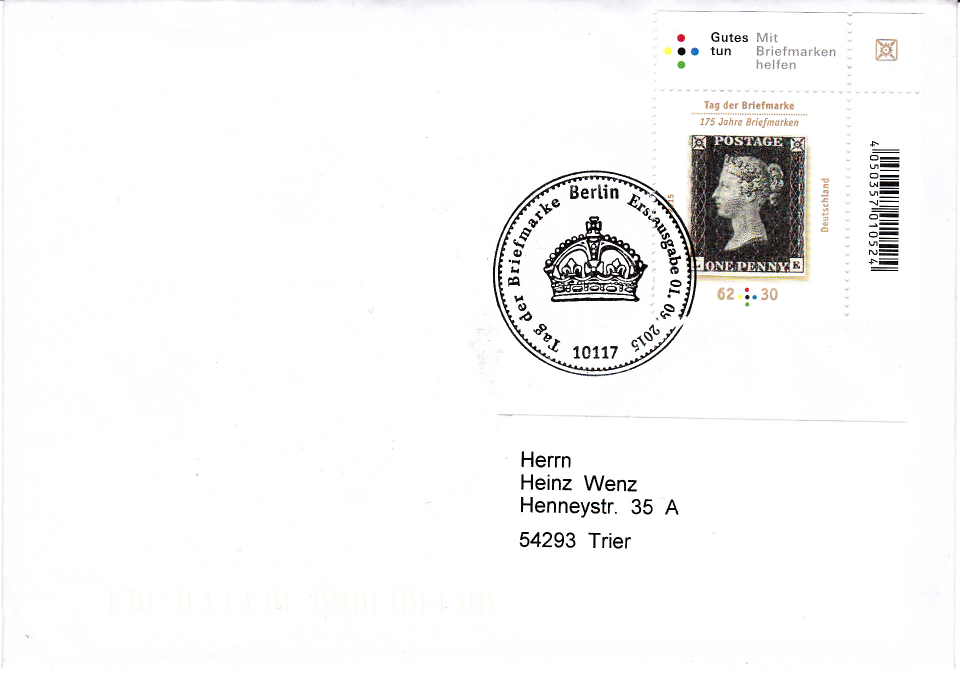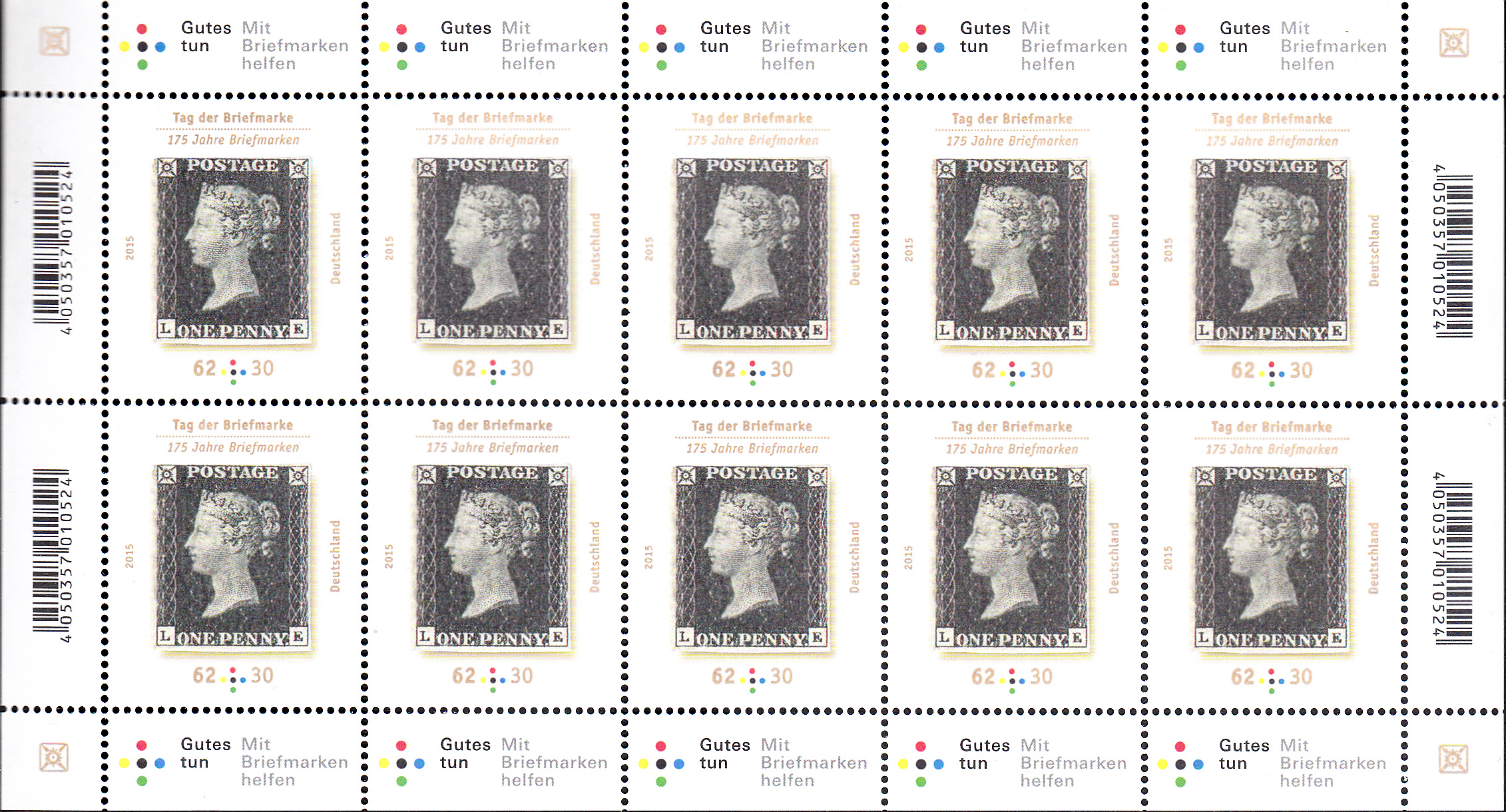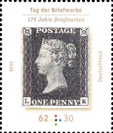 Zum Tag der Briefmarke 2015 erschien am 1.9.2015 bei der Deutschen Post eine Zuschlagsmarke (MiNr 3173) mit der Abbildung der ersten Briefmarke, die vor 175 Jahren (Großbritannien MiNr 1) erschienen ist.