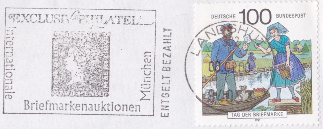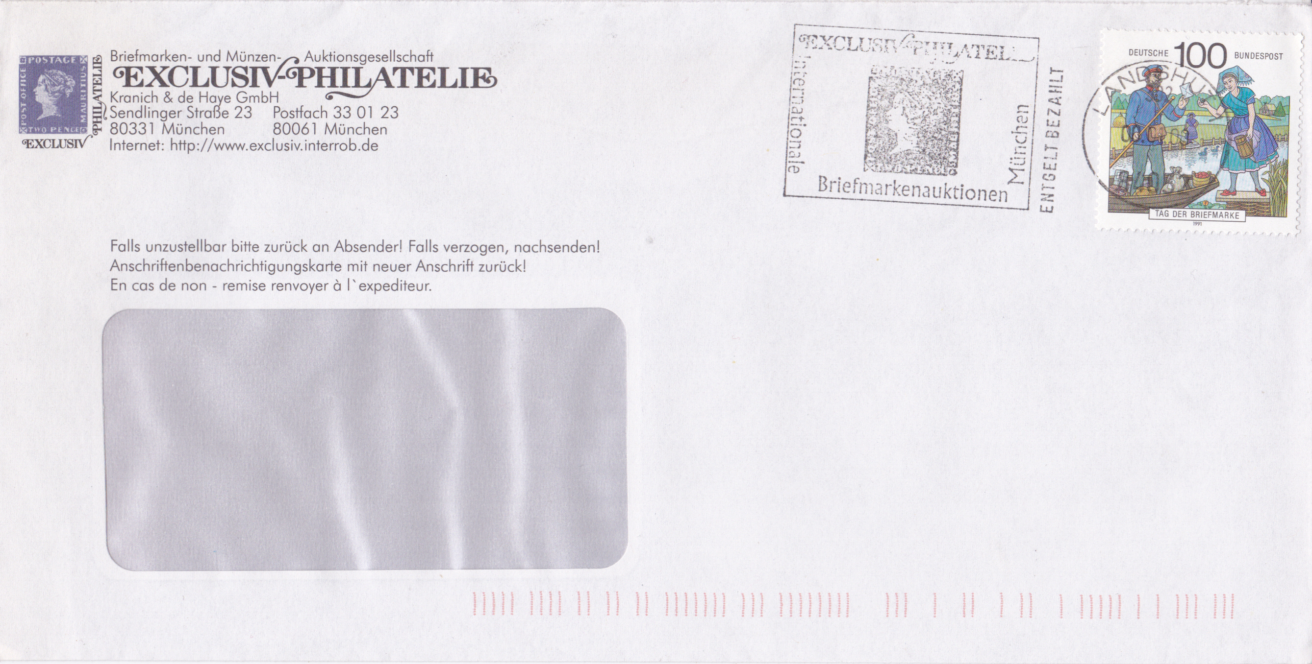 Absenderentwerter 84052 Landshut 1 mit der "Blauen Mauritius" imWerbeeinsatz auf einem Umschlag Infopost.