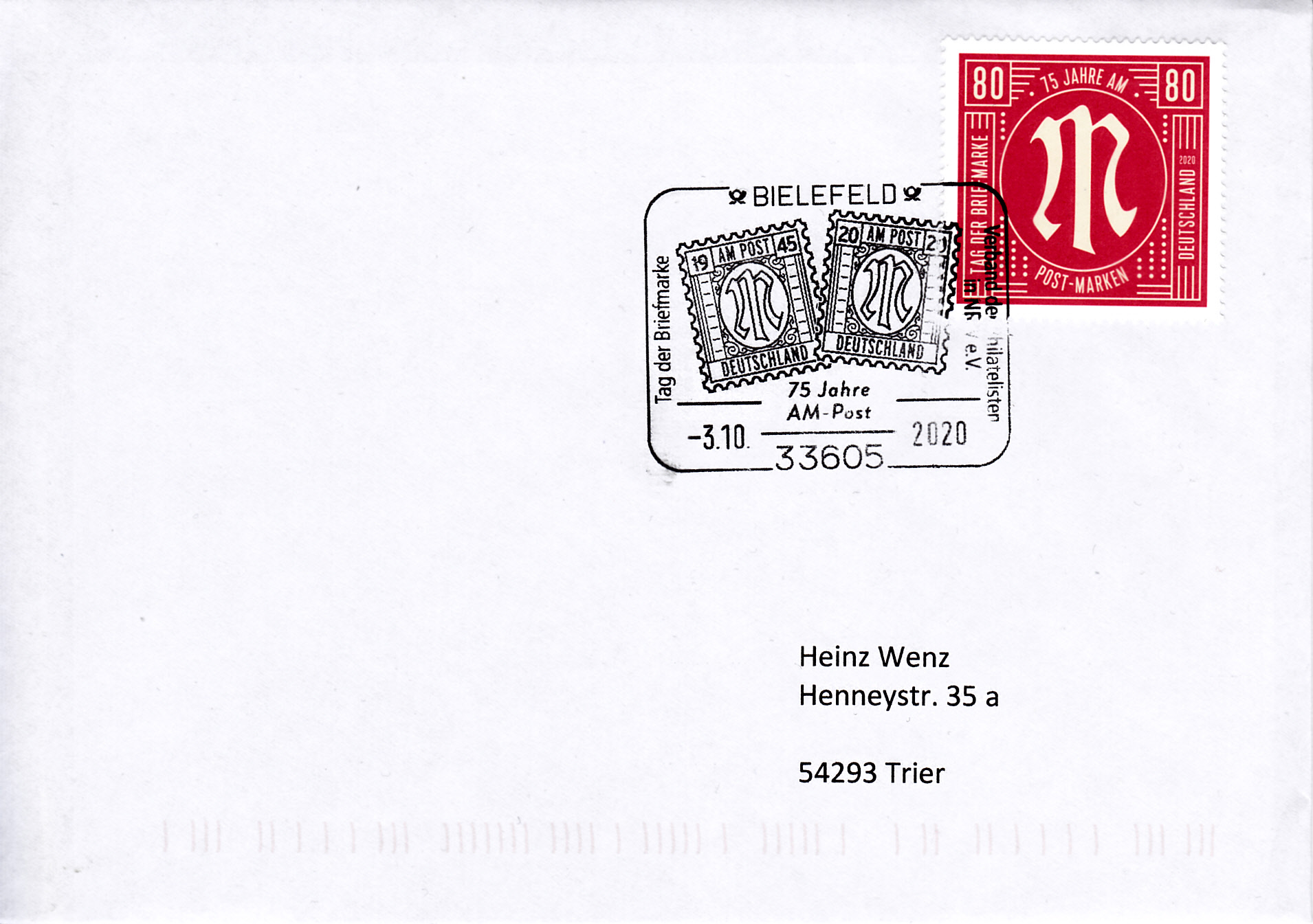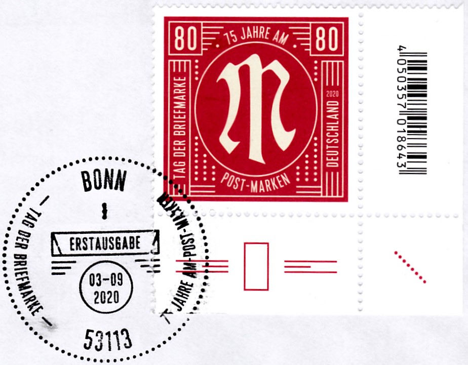 Bei der Deutschen Post ist zum Tag der Briefmarke 2020 eine Marke zu 80 Cent erschienen. Sie zeigt zum Jubiläum 75 Jahre AM-Post-Marken eine "Neuinterpretation des AM-POST-Markendesigns". Hier zeige ich ein Eckrandstück mit EAN-Codierung.