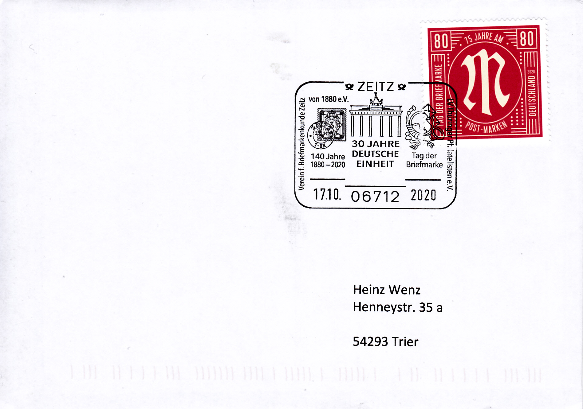 Am 17.10.2020 gab es in Zeitz den Sonderstempel zum Tag der Briefmarke des Landesverbandes Thüringer Philatelisten e.V. mit der Abbildung einer Marken des Deutschen Reiches zu 3Pf mit der Abbildung "Ziffer im Oval" (MiNr 39).