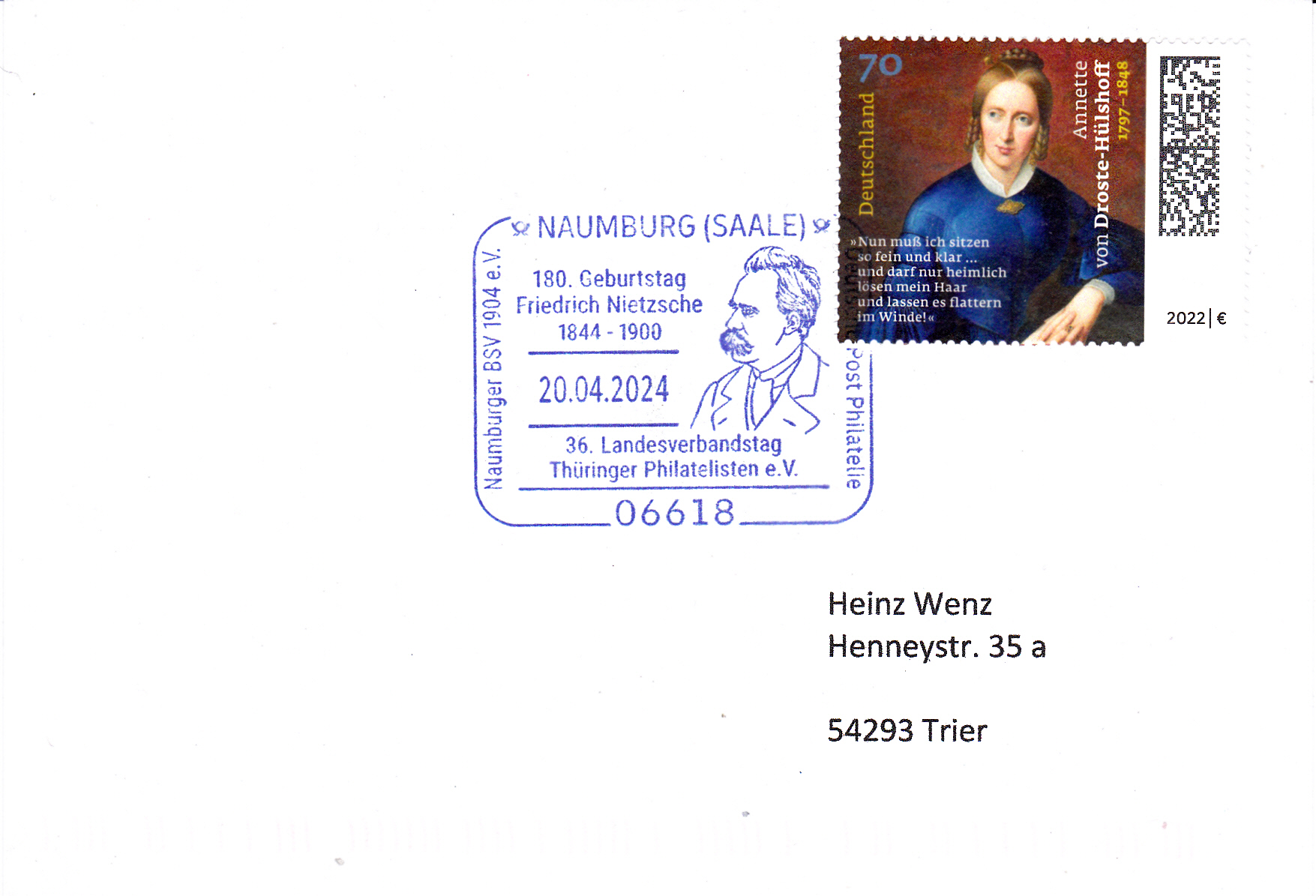 Postkarte mit einem Sonderstempel vom 20.4.2024 aus Naumburg (Saale) zum 180. Geburtstag von F. Nietzsche mit seinem Porträt.