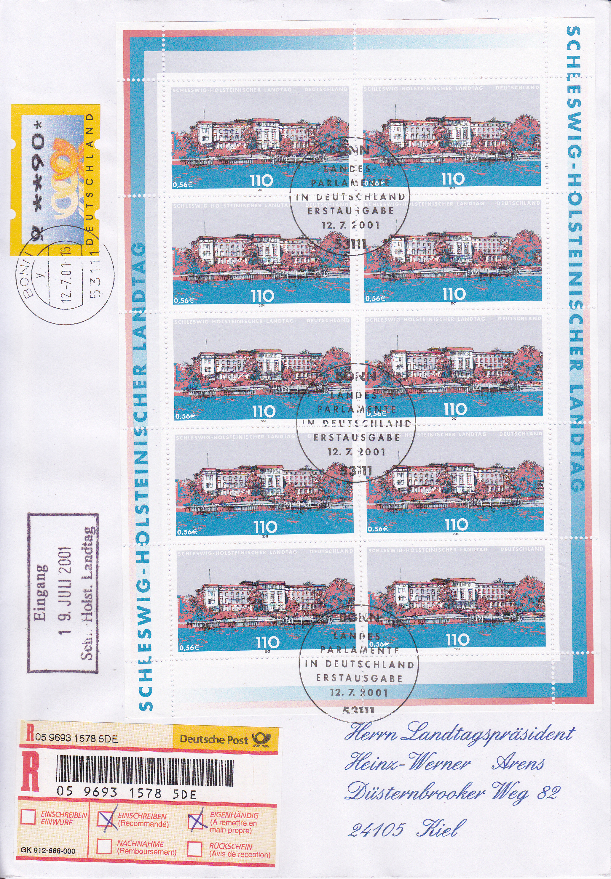 Brief vom Ersttag per Einschreiben Eigenhändig mit einem kompletten Bogen der Marke "Landtag von Schleswig-Holstein, Kiel" (MiNr 2198) adressiert an den Landtagspräsidenten. Das Einschreibelabel trägt den Zusatz "Landtag des Saarlandes. Das Porto reicht aus für einen Brief bis 1000 Gramm (440Pf +400Pf Einschreiben + 350Pf Eigenhändig).