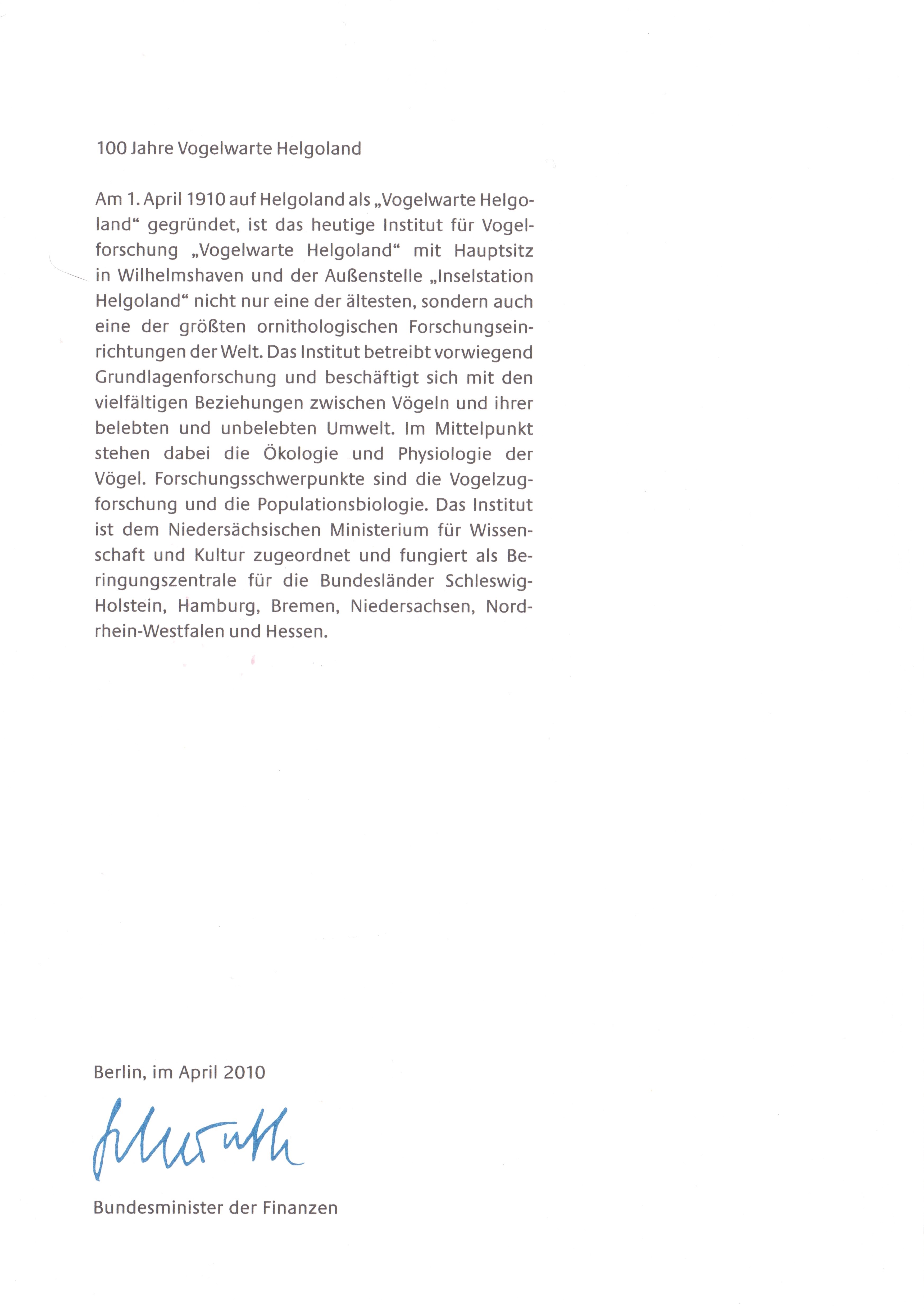 Blockausgabe: 100 Jahre Vogelwarte Helgoland: