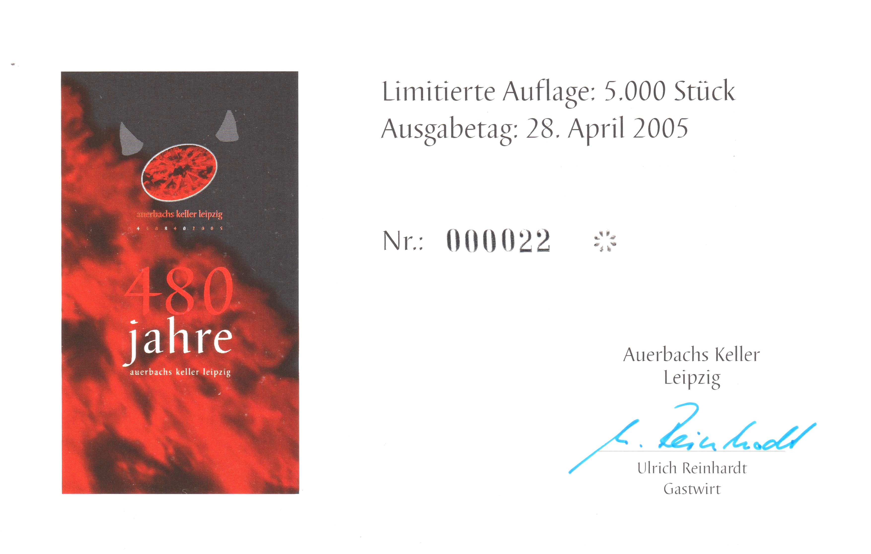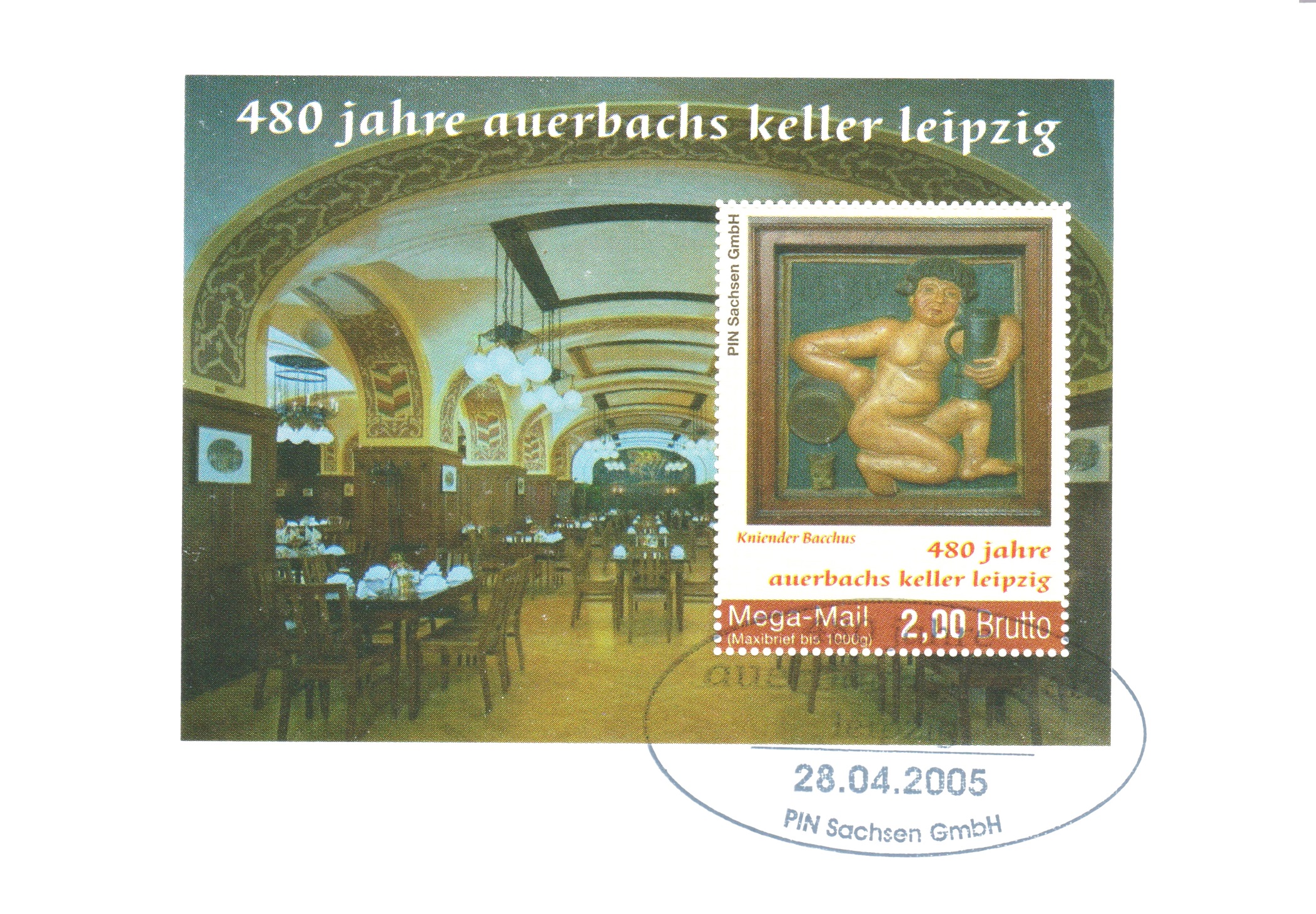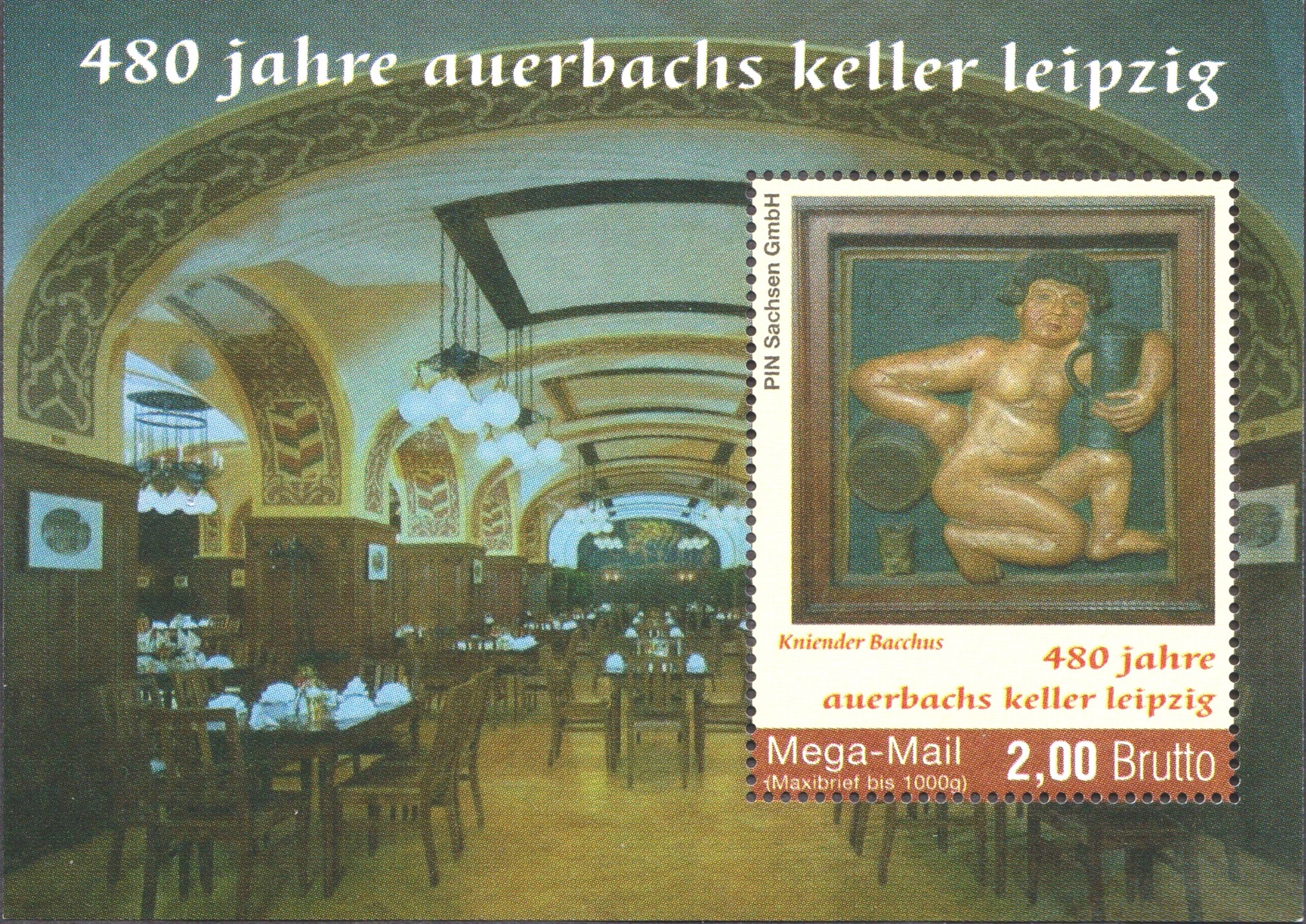 Dieses Postwertzeichen der PIN Sachsen GmbH zeigt den "Knienden Bacchus" im Restaurants Auerbachs Keller in Leipzig, hier eine gestempelte linke obere Bogenecke mit Stempel vom 03.01.2005 (= Ersttag):