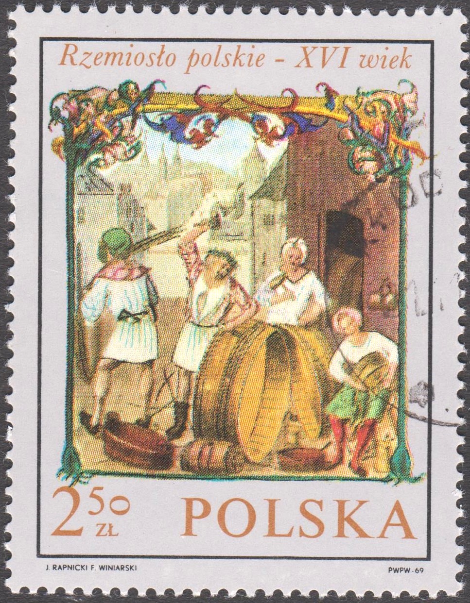 Zum Thema "Böttcher" paßt Polen MiNr. 1967 mit dieser Miniaturmalerei "Beim Böttcher" aus dem "Kodex von Behem", dem Gesetzbuch der Stadt Krakau von 1505: