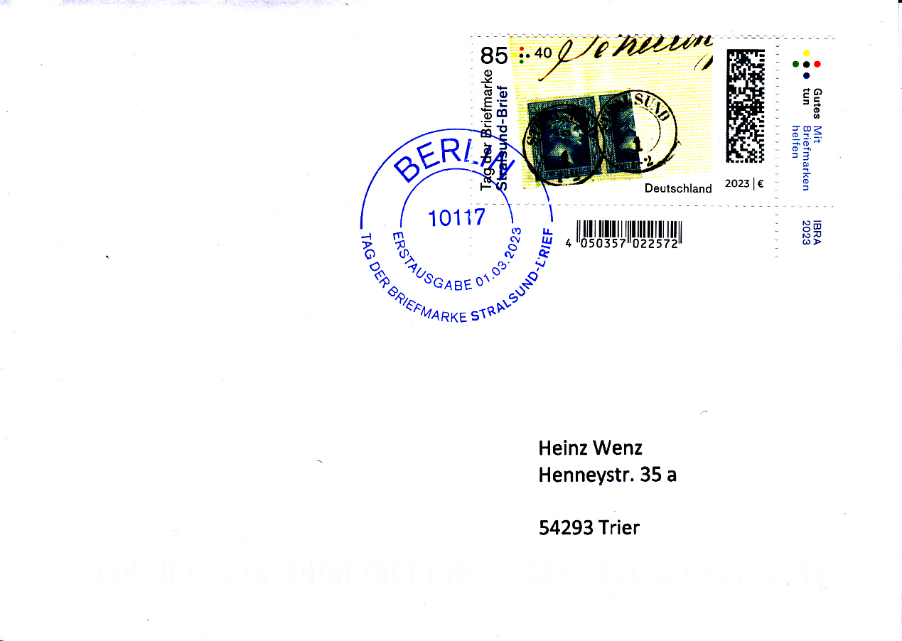 Dieser Brief mit der Marke zum TdB (MiNr 3752) wurde mit dem Sonderstempel zur Übergabe der Marke vom 2.3.2023 aus Berlin gestempelt.