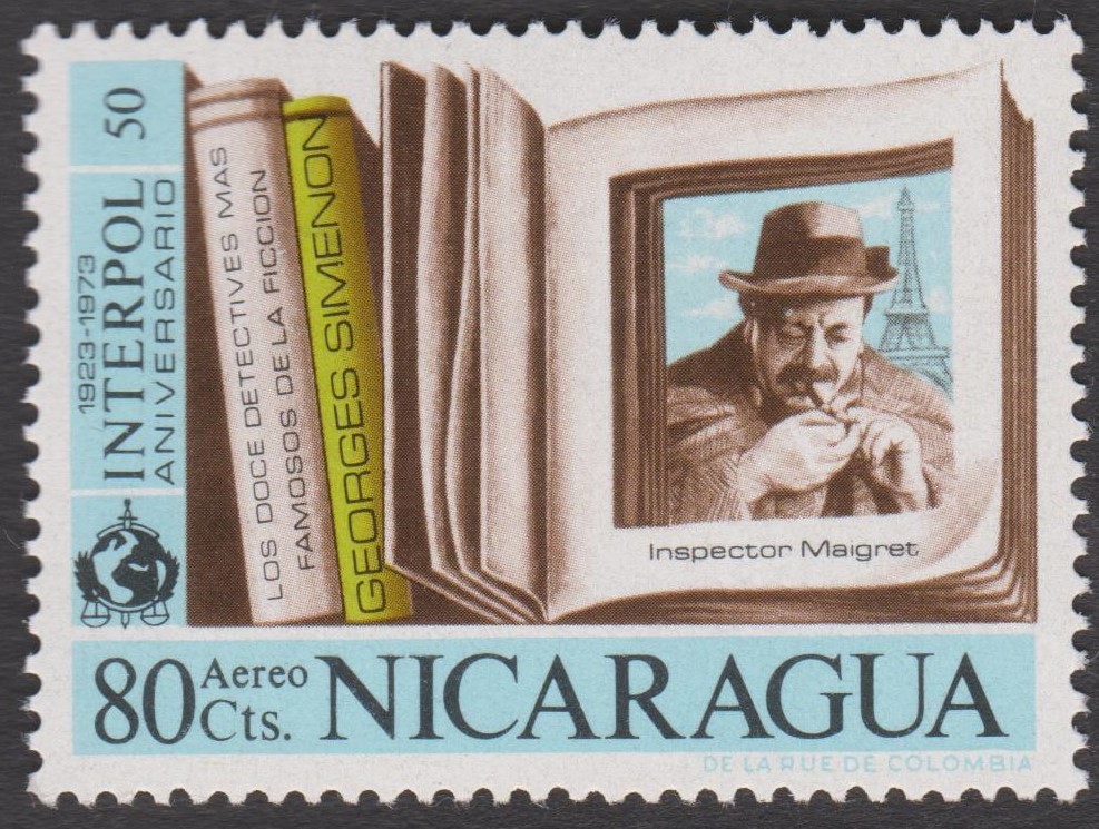 Dieses Postwertzeichen aus Nicaragua würdigt Kommissar Maigret im Rahmen eines Satzes zum Thema Interpol: