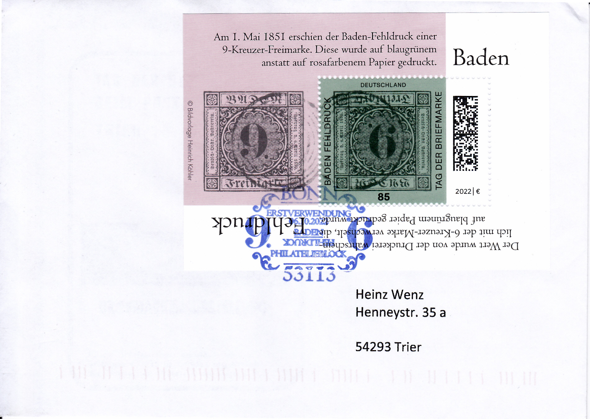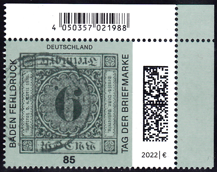 Zum Tag der Briefmarke 2021 ist bei der Deutschen Post eine Marke (MiNr 3719) mit dem Baden-Fehldruck MiNr. 4 F erschienen. Die Marke in schwarz auf blaugrünem statt lilarosa Papier, entwertet mit einem Fünfring-Nummernstempel "41", ist kopfstehend abgebildet.