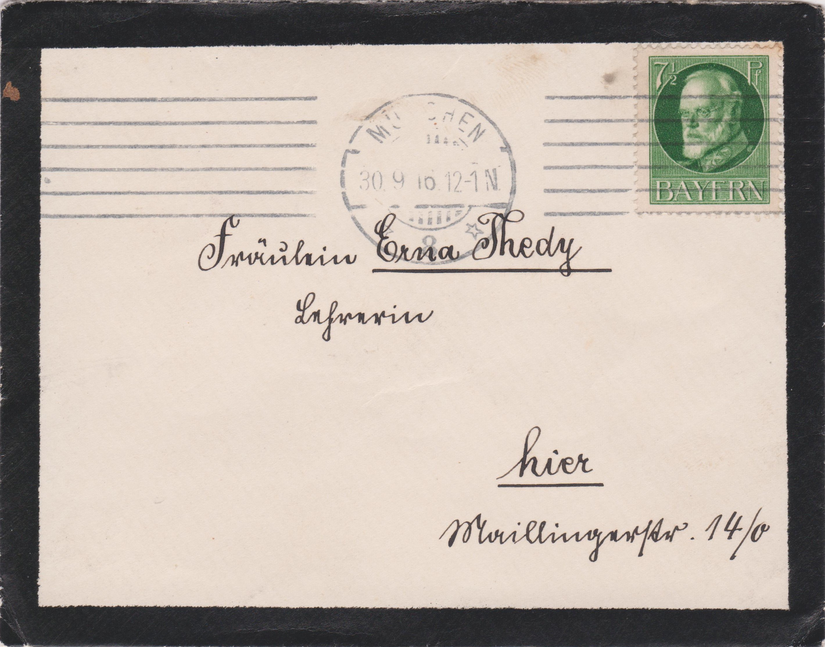 Einzelfrankatur Bayern MiNr. 113 am 30.09.1916 auf Trauerbrief, gelaufen im Ortsverkehr von München: