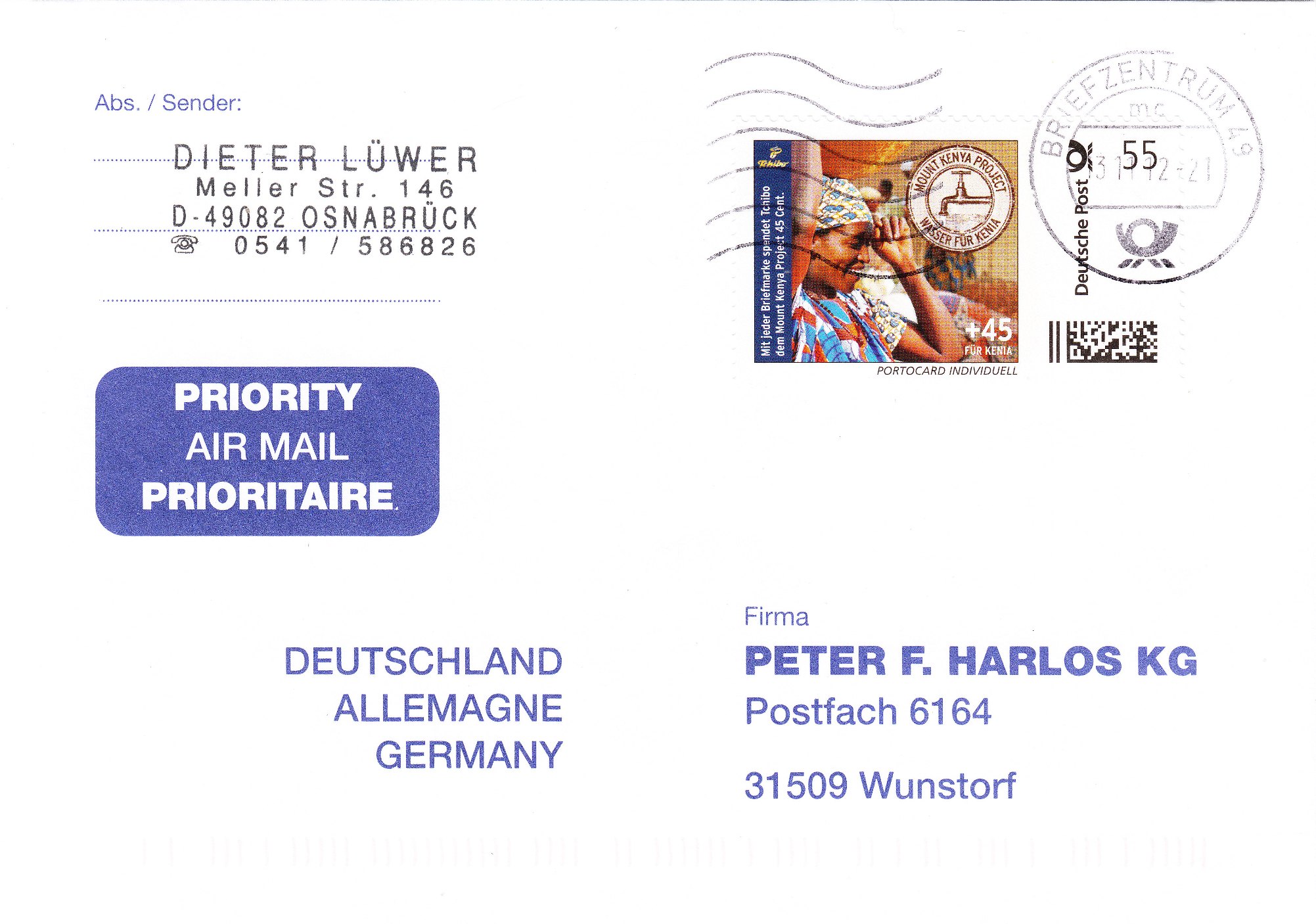 Hier eine der Marken aus der Portocard Individuell von Tchibo am 27.01.2012 gestempelt im Briefzentrum 55:
