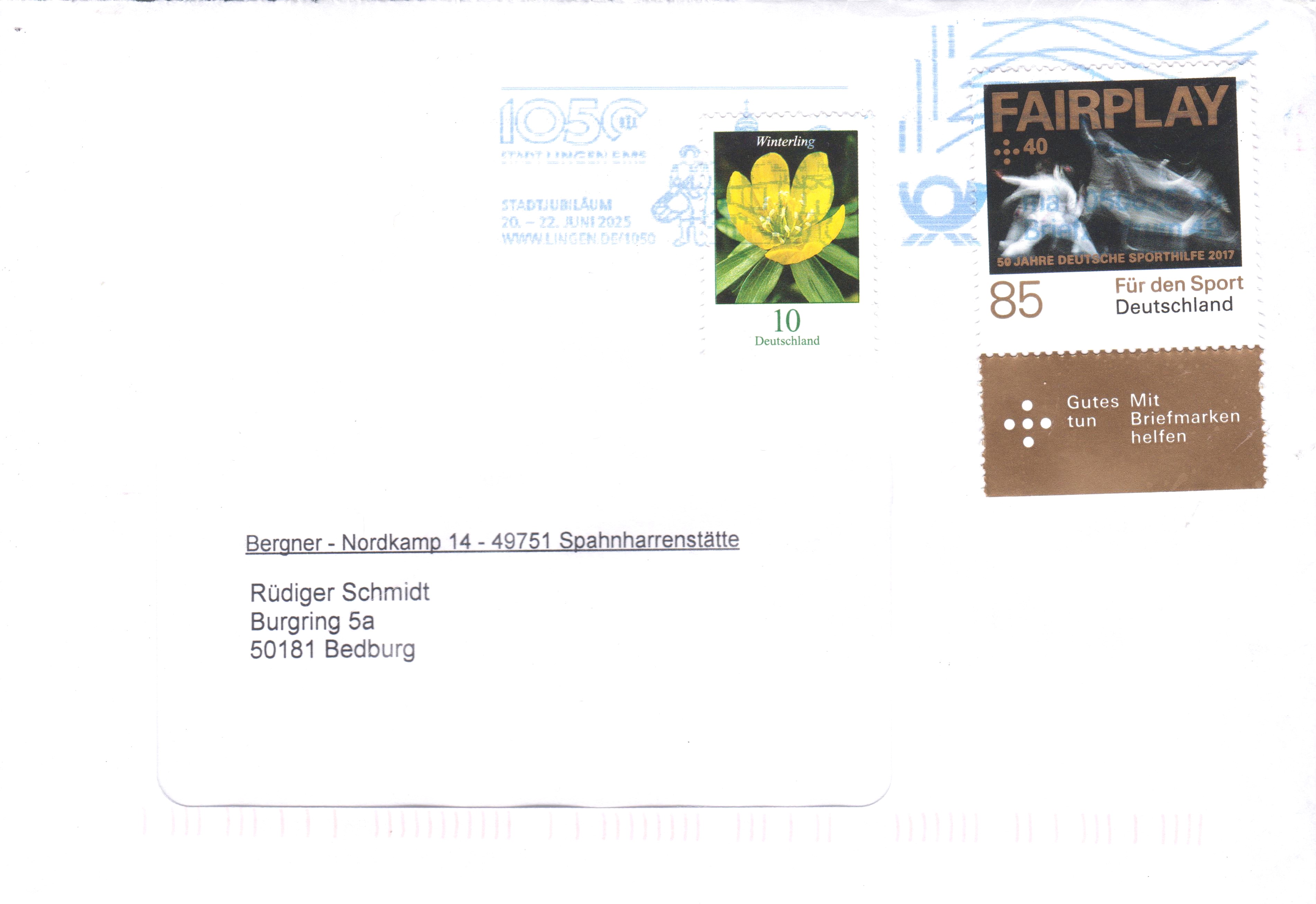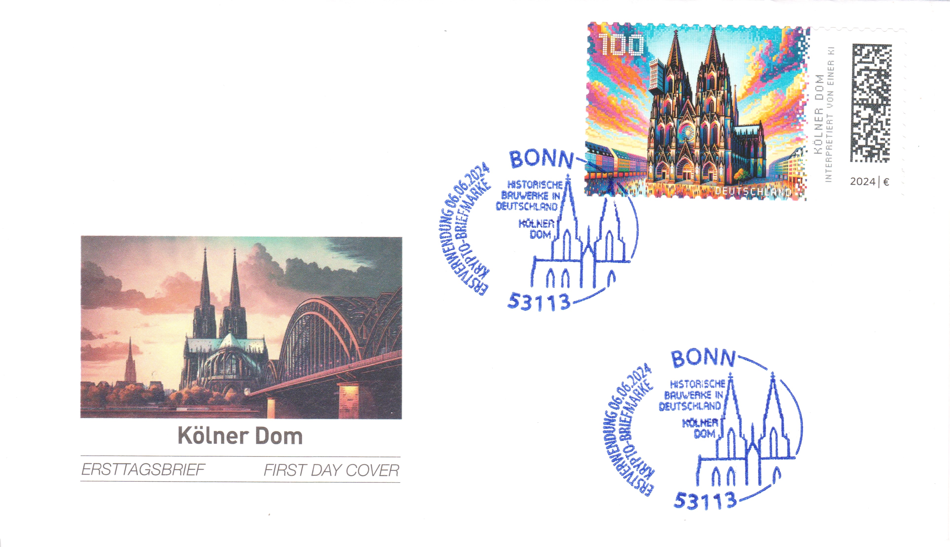Hier zeige ich ein MH in der Farbe Gelb (häufigste Variante) sowie die daraus stammende Krypto-Marke verklebt auf einem nicht gelaufenen Ersttagsbrief mit Sonderstempel vom Erstverwendungstag 06.06.2024: