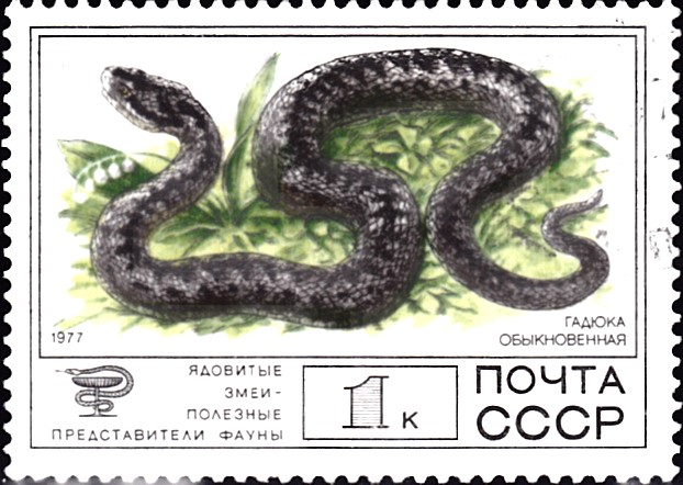 In einer Serie "Giftschlangen und Säugetiere" erschien Sowjetunion MiNr. 4678 mit einer Kreuzotter (Vipera berus):