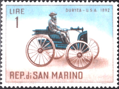 San Marino MiNr. 704 zeigt einen von Charles Duryea und seinem Bruder Frank gebauten Duryea Motor Wagon.