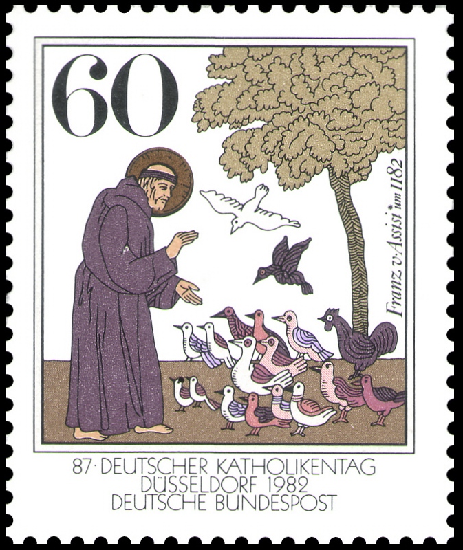 „Als er sich Bevagna näherte, kam er zu einem Ort, an dem eine große Menge von Vöglein verschiedener Art zusammengekommen war: als der Heilige Gottes dieselben sah, lief er eilig dahin und begrüßte sie, als wären sie der Vernunft teilhaftig. Sie aber alle erwarteten ihn und wandten sich zu ihm, so daß die, welche auf den Gesträuchen waren, die Köpfchen senkten, als er sich ihnen näherte, und in ungewohnter Weise sich nach ihm hinrichteten, bis er zu ihnen heranschritt und sie alle eifrig ermahnte, das Wort Gottes zu hören, indem er sprach: »Meine Brüder Vöglein, gar sehr müßt ihr euren Schöpfer loben, der euch mit Federn bekleidet und die Flügel zum Fliegen gegeben hat; die klare Luft wies er euch zu und regiert euch, ohne daß ihr euch zu sorgen braucht«. Als er ihnen aber dies und ähnliches sagte, begannen die Vögel, in wunderbarer Weise ihre Freude bezeugend, die Hälse zu recken, die Flügel auszubreiten, die Schnäbel zu öffnen und aufmerksam auf ihn zu schauen. Er selbst aber in wunderbarer Glut des Geistes schritt mitten durch sie hin und berührte sie mit seinem Gewande; und dennoch bewegte sich keiner von der Stelle, bis er das Zeichen des Kreuzes machte und ihnen mit dem Segen des Herrn die Erlaubnis gab. Da flogen sie alle zugleich von dannen. Dies alles sahen die Genossen, die am Wege warteten.“