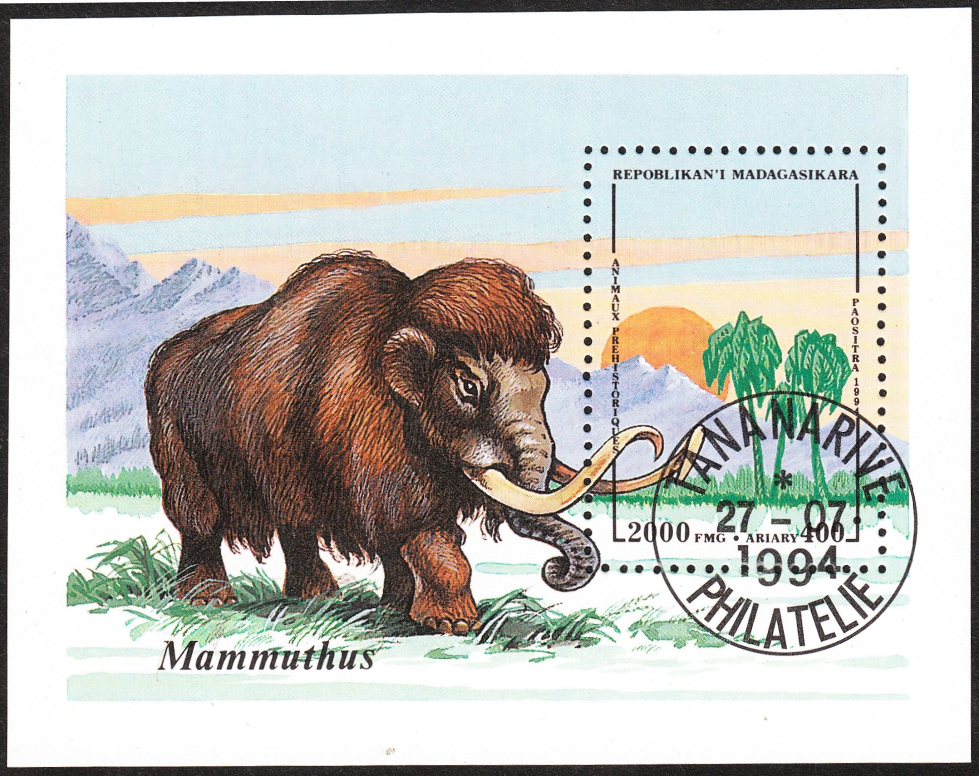Der am 27.07.1994 erschienene Block 257 aus Madagaskar zeigt ein Mammut, wobei auf der in diesem Block enthaltenen Briefmarke lediglich die Spitzen der Stoßzähne des Mammuts zu sehen sind: