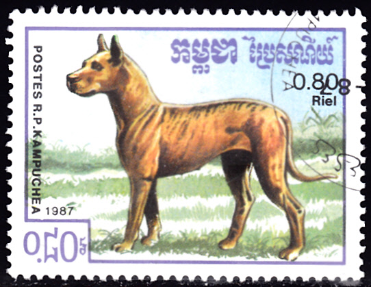 Auf dieser Marke aus Kambodscha MiNr. 848 ist eine Deutsche Dogge zu sehen:
