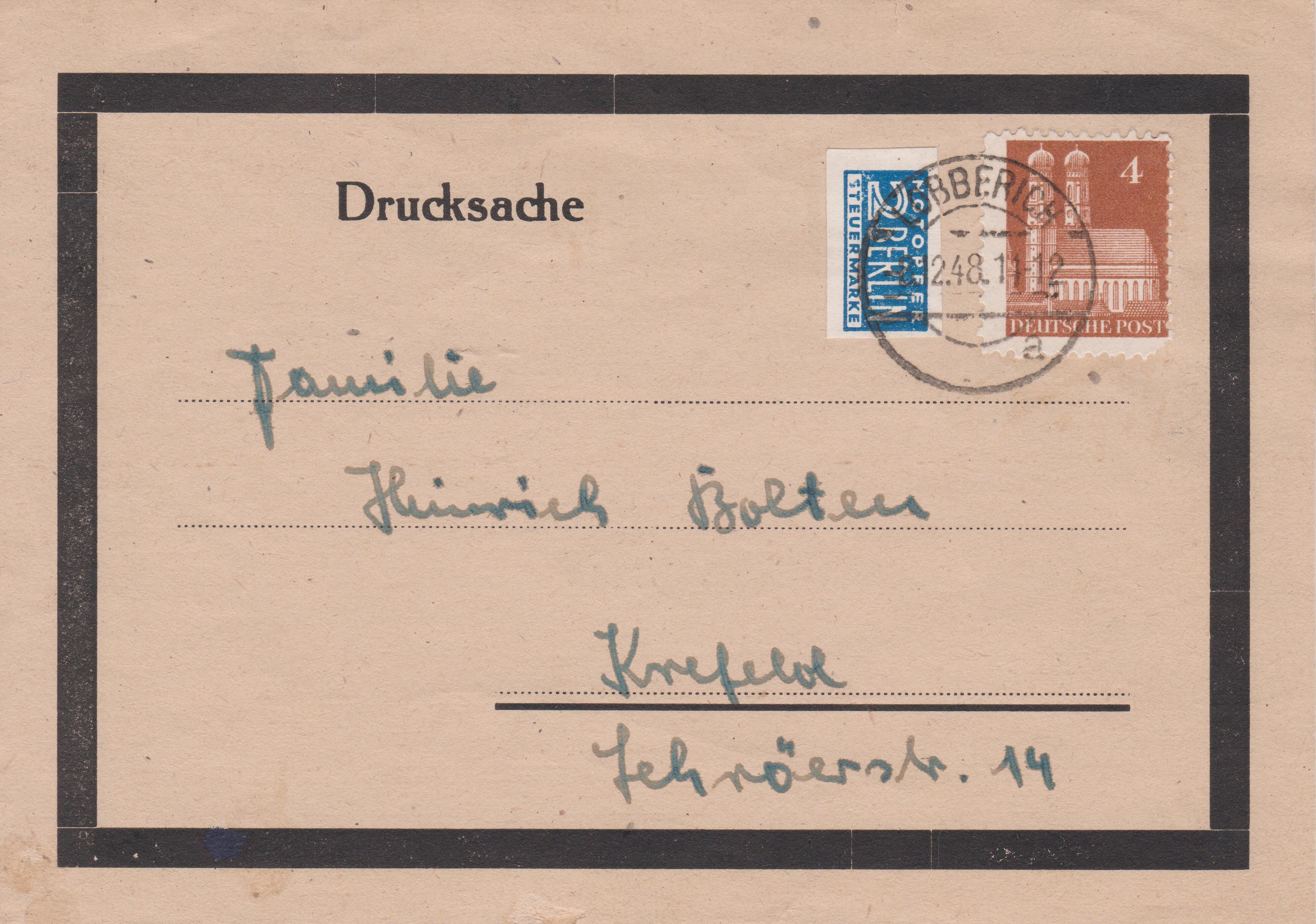 Trauerbrief, an 27.12.1946 in PLETTENBERG 1 als Drucksache, Portostufe 6 Pf, freigemacht mit zwei Postwertzeichen AM POST 3 Pf: