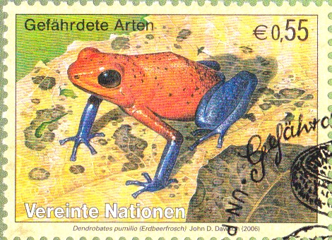 Vereinte Nationen Wien MiNr. 461 bildet ein Erdbeerfröschchen (Oophaga pumilio; Syn.: Dendrobates pumilio) ab: