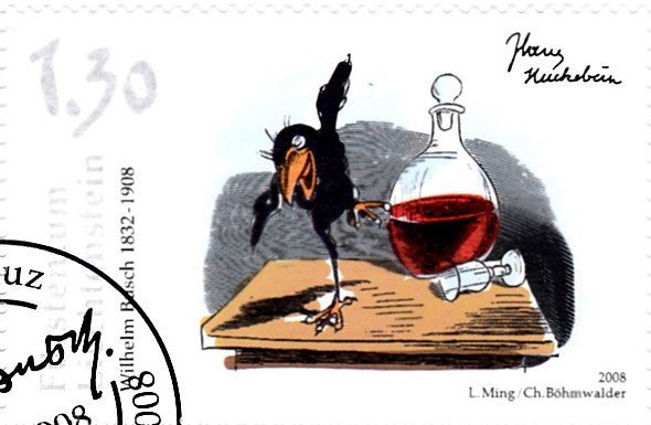 Zum Jubiläum "150 Jahre Rabe Hans Huckebein" kam in Wiedensahl ein Sonderstempel mit der Abbildung einer Szene aus der gleichnamigen Geschichte zum Einsatz.