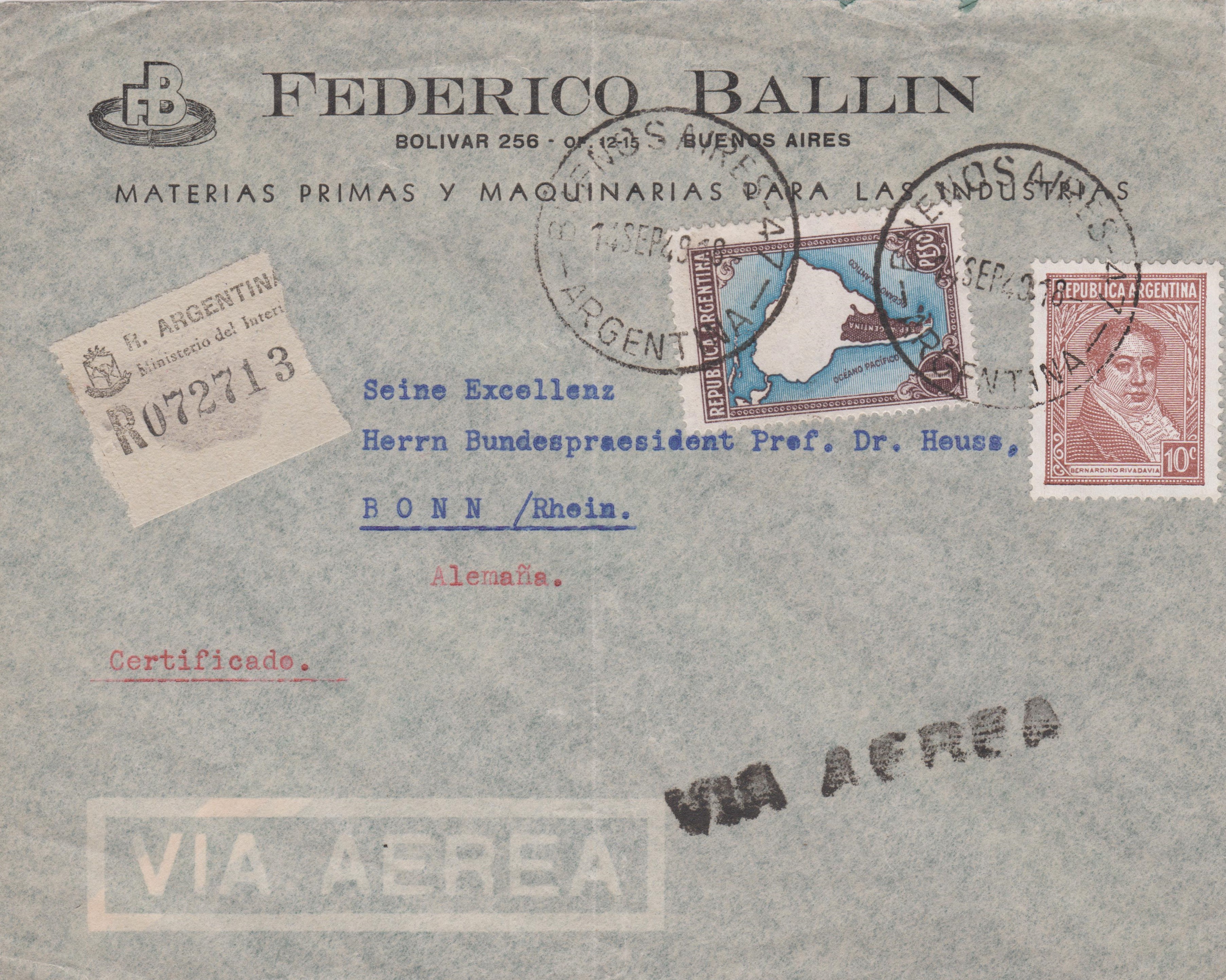 Brief aus Argentinien, adressiert an "Seine Excellenz Herrn Bundespraesident Prof. Dr. Heuss":