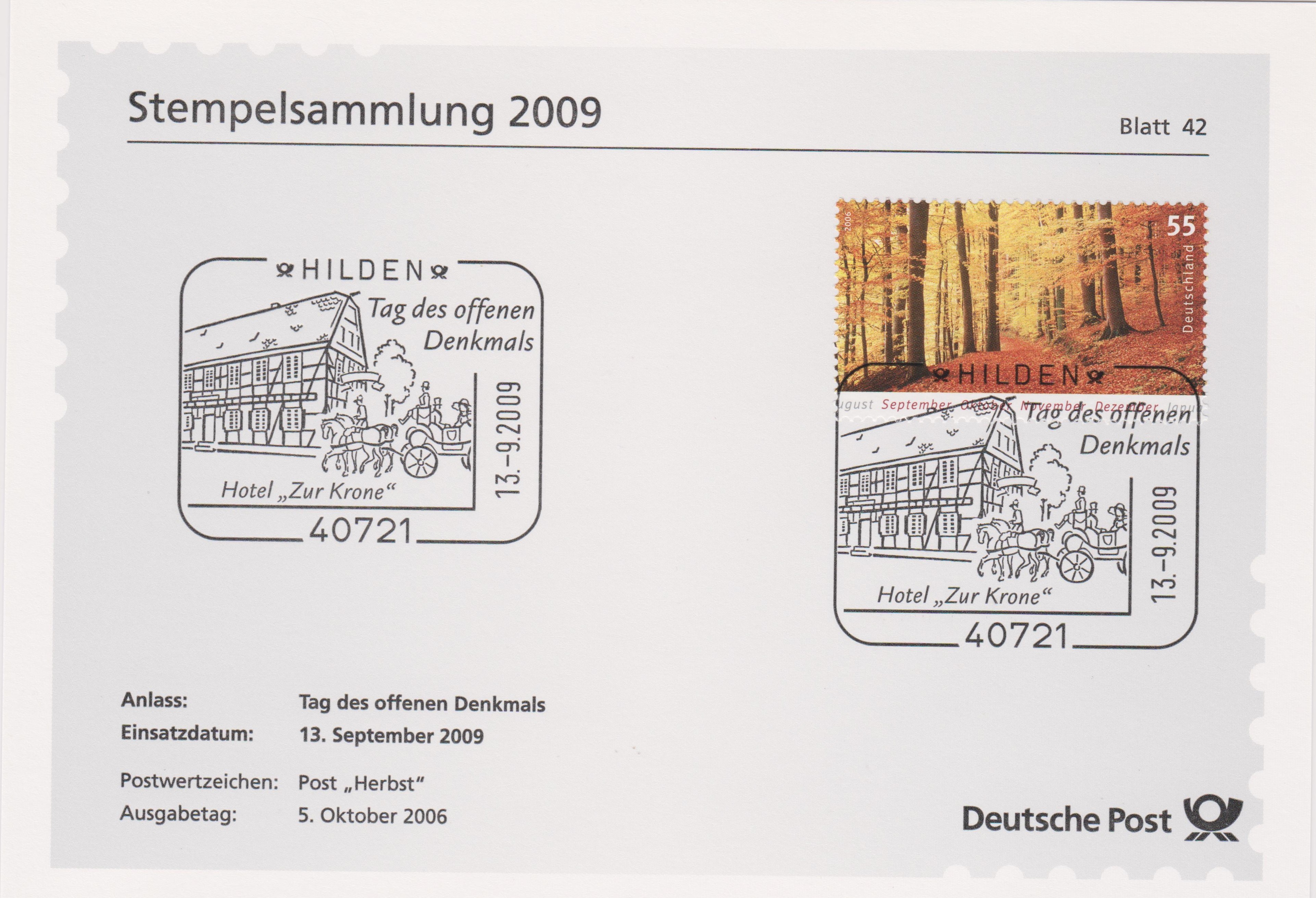 Blatt 42 der Deutsche Post Stempelsammlung 2009 zeigt einen Sonderstempel aus 40721 HILDEN zu diesem Thema mit dem Motiv "Hotel Zur Krone":