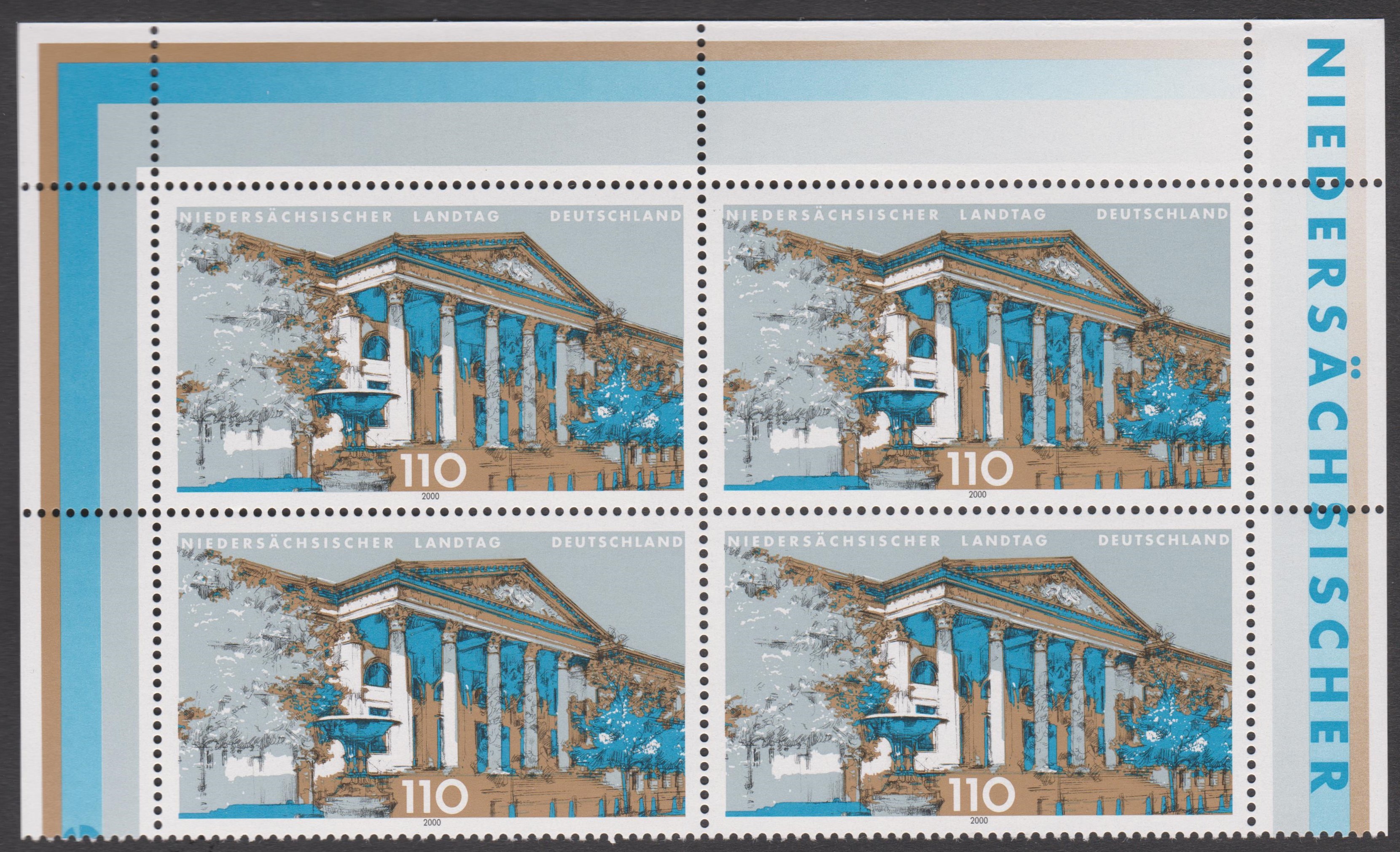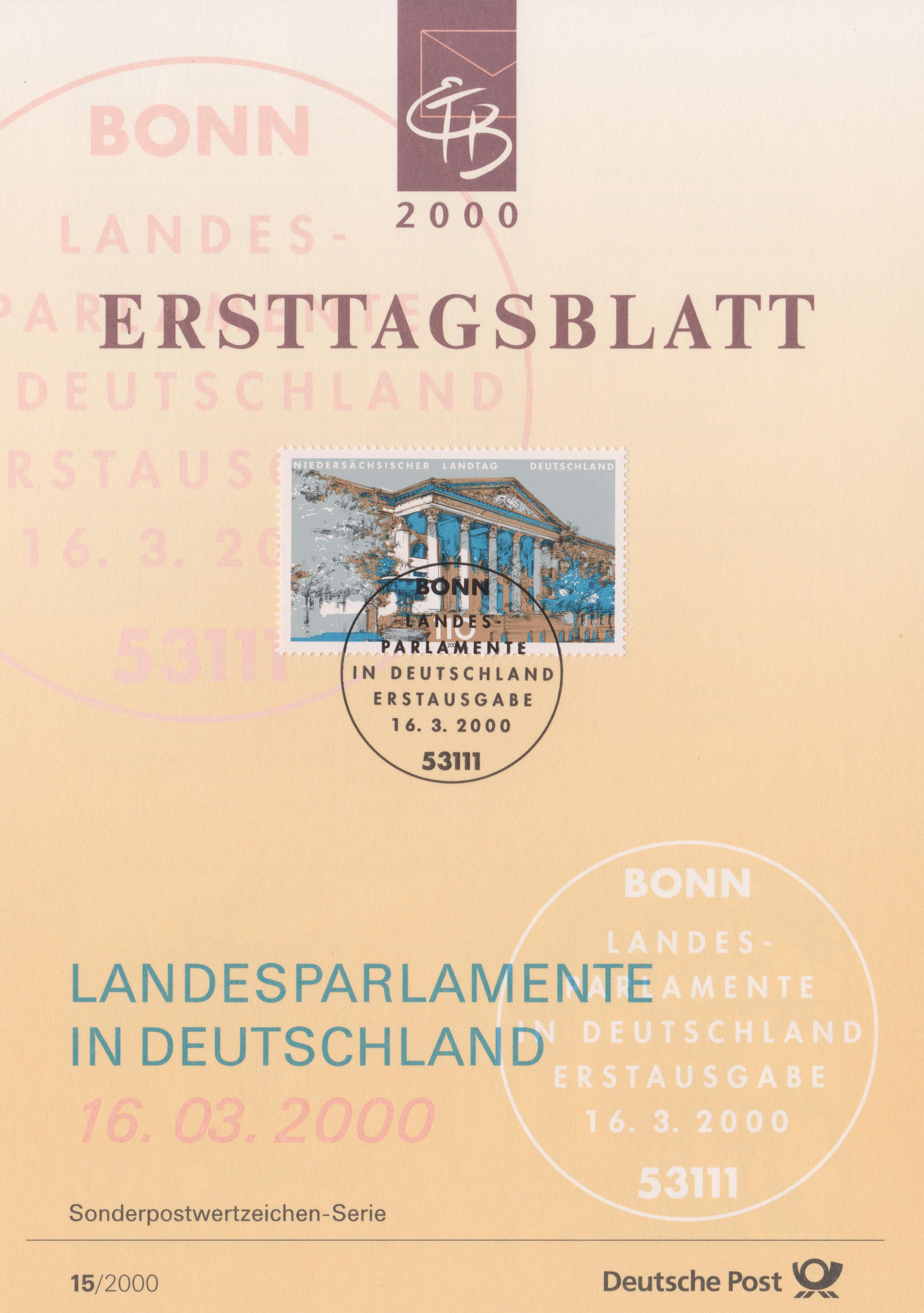 Dieses ETB 15/2000 zeigt den Niedersächsischen Landtag in Hannover, Bund MiNr. 2104, aus einer Sonderpostwertzeichenserie "Landesparlamente in Deutschland":