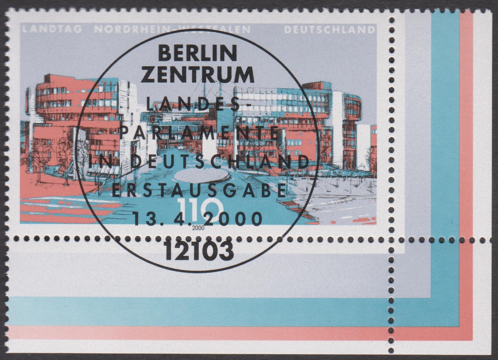 BUND MiNr. 2110 zeigt das Landtagsgebäude Nordrhein-Westfalen, hier auf ETB 20/2000: