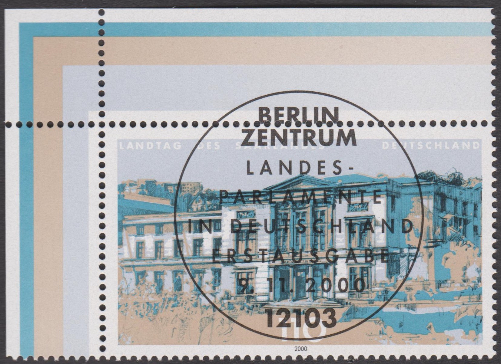 Dieses ETB 51/2000 zeigt den Landtag des Saarlands in Saarbrücken, Bund MiNr. 2153, aus einer Sonderpostwertzeichenserie "Landesparlamente in Deutschland":