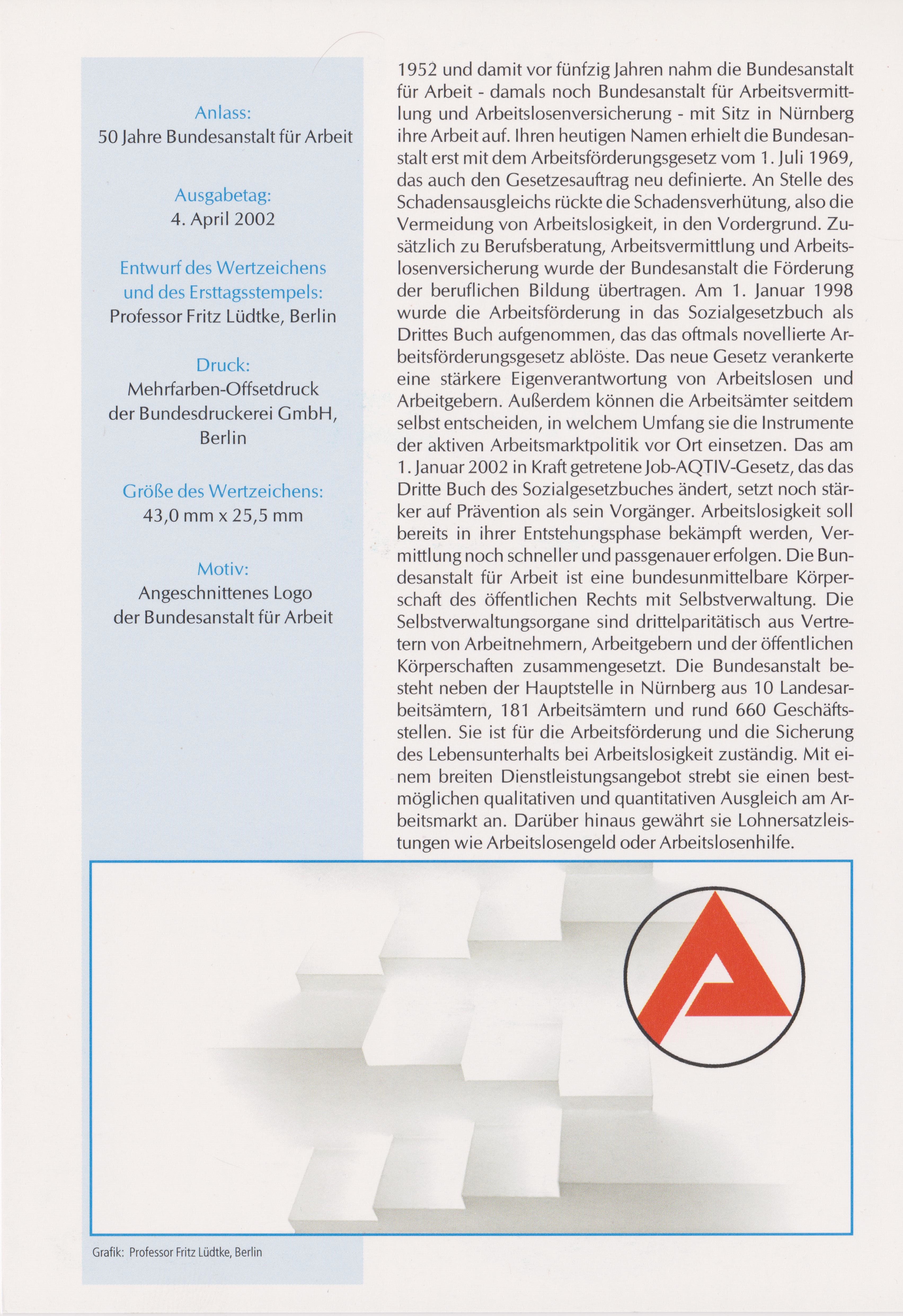 Bund MiNr. 2249 erschien am 04.04.2002 aus Anlaß "50 Jahre Bundesanstalt für Arbeit", hier auf ETB 14/2002: