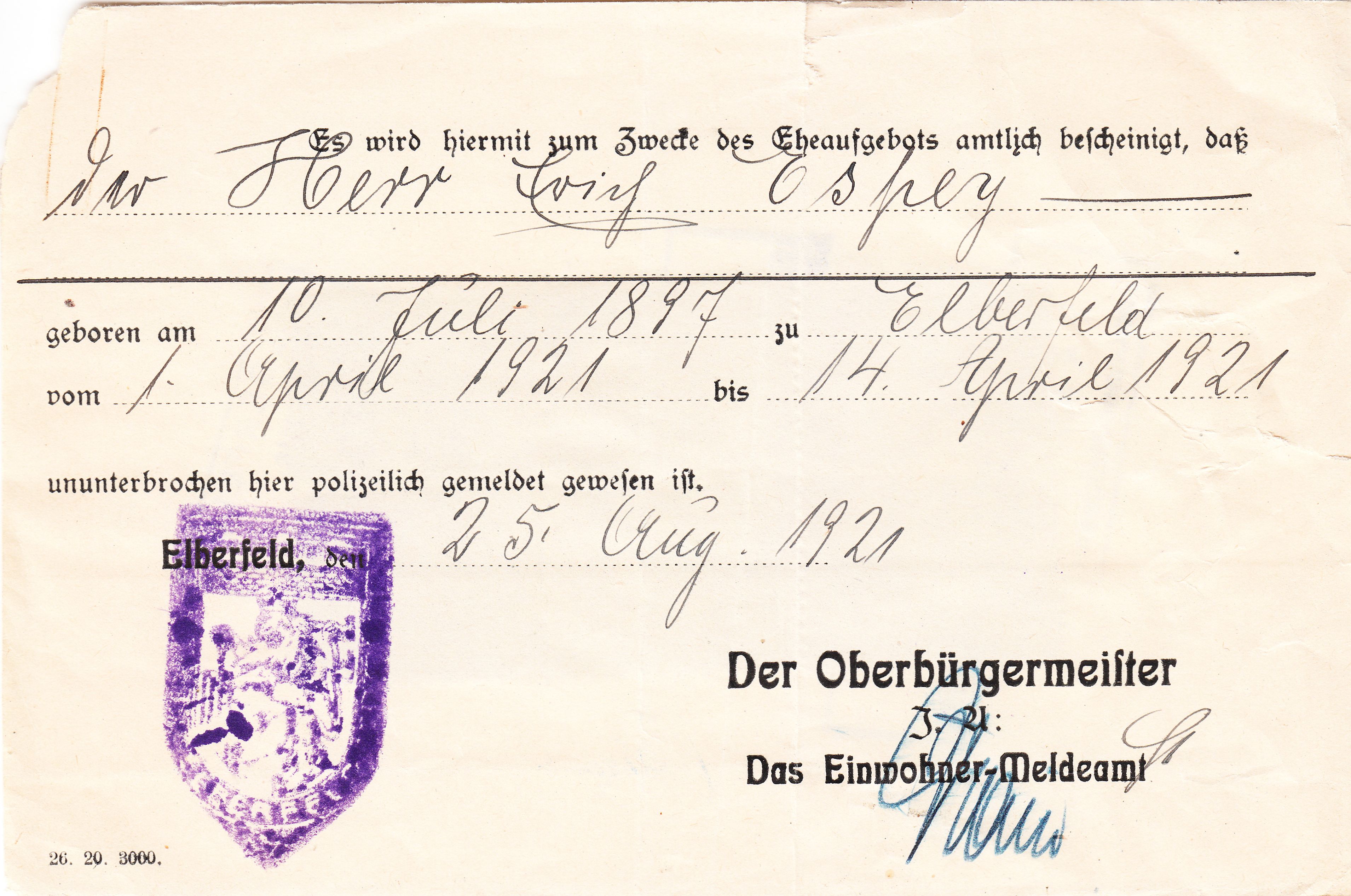 Das Einwohner-Meldeamt Eberfeld bescheinigte mit diesem Dokument am 25.08.1921 "zum Zwecke des Eheaufgebots" amtlich, dass der Bräutigam während der 14tägigen Frist des Eheaufgebots vom 01.04.1921 bis 14.04.1921 "ununterbrochen hier polizeilich gemeldet gewesen ist":