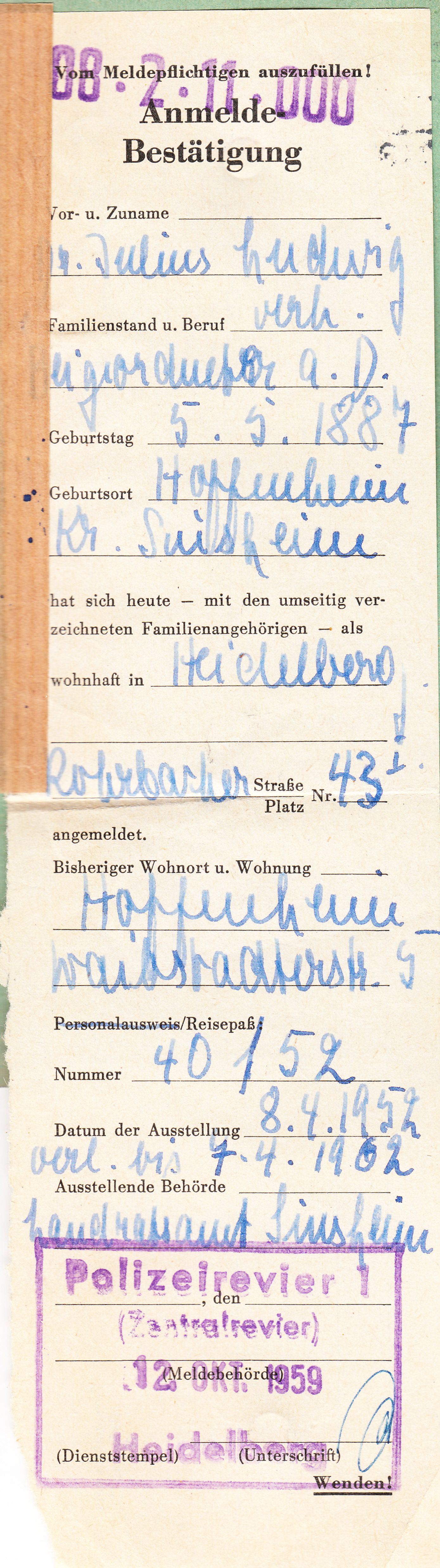 Auf der vorderen inneren Umschlagseite wurden eine Anmelde-Bestätigung sowie eine Meldebestätigung eingeklebt: