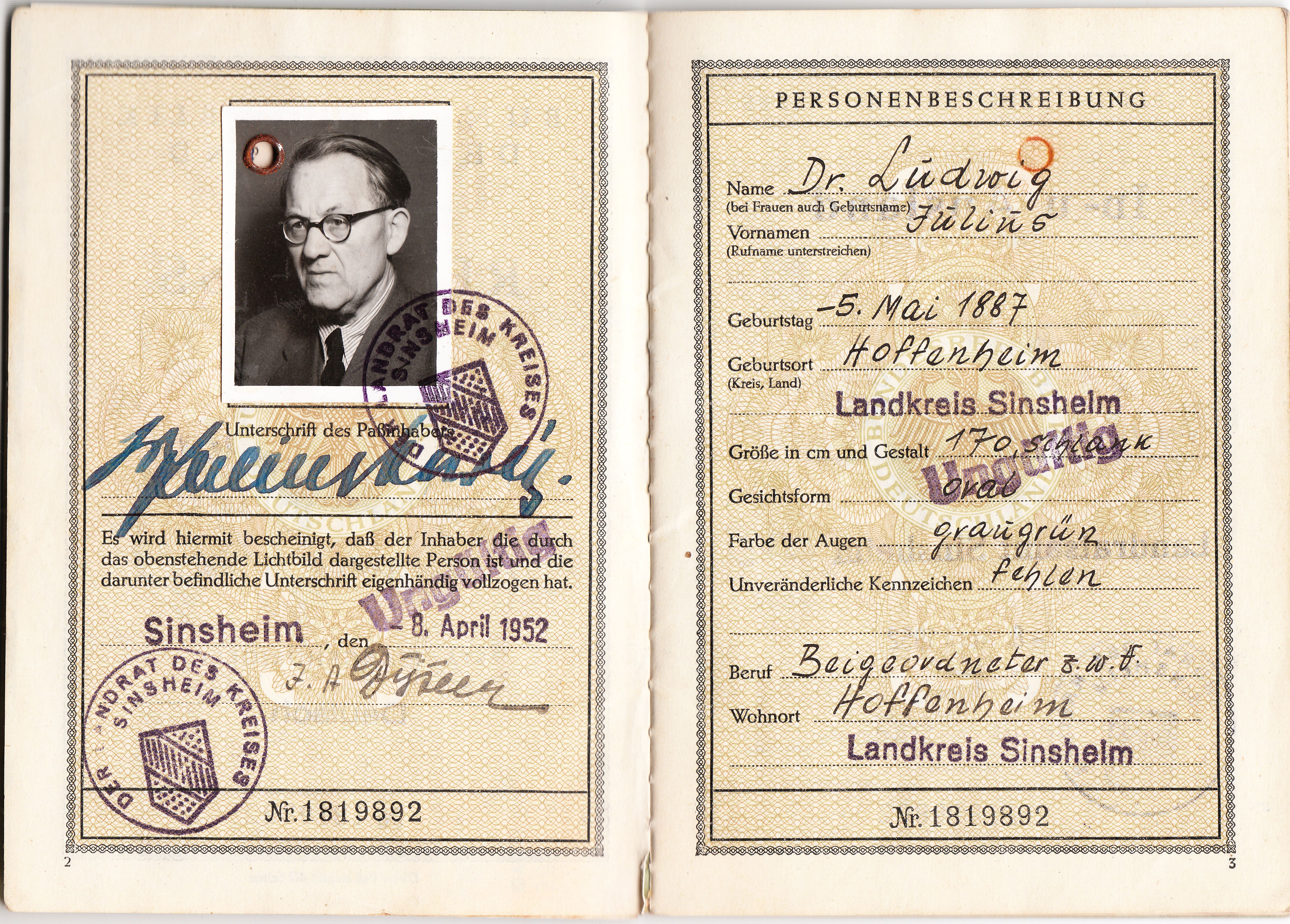 Als Berufsbezeichnung diente "Beigeordneter" und als solcher brauchte der Passinhaber weder für die Ausstellung noch die Verlängerung dieses Passes eine Gebühr zu zahlen: