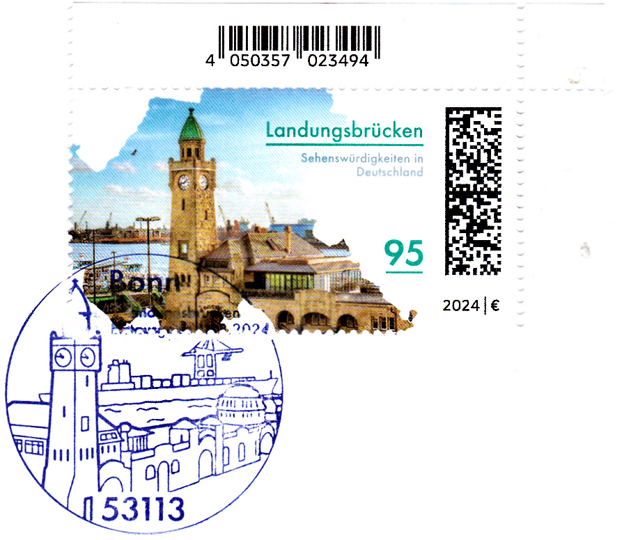 In der Serie "Sehenswürdigkeiten in Deutschland" ist eine Marke (MiNr 3818) mit den Landungsbrücken am Hamburger Hafen erschienen. Hier zeige ich eine Marke vom Eckrand mit EAN-Codierung.