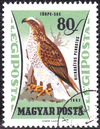 Auf einer Marke aus Ungarn (MiNr 1884 A) ist ein Zwergadler (Hieraetus pennatus) abgebildet.