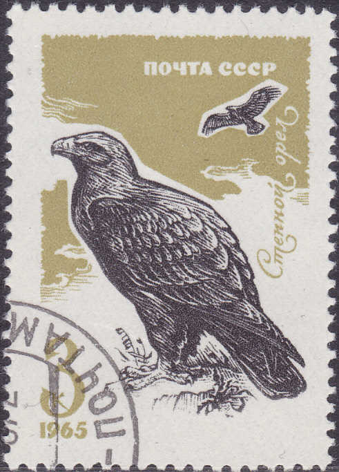 Eine Marke aus der Sowjetunion (MiNr 3148) zeigt einen sitzenden Raubadler (Aquila rapax) und einen im Flug.
