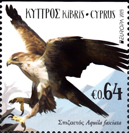 Diese Marke aus Israel (MiNr 982) zeigt uns einen Habichtsadler (Hieraetus fasciatus) bei einem Sturzflug und auf dem anhängenden Tab einen Kopf des Vogels.
