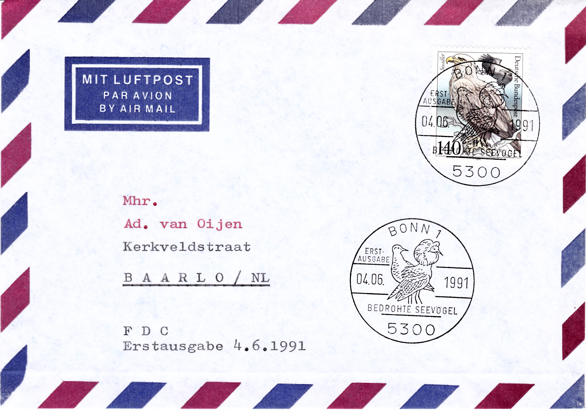 Bei diesem Brief mit der Marke "Seeadler" und dem Ersttagsonderstempel Bonn ist eine nachträgliche Beschriftung nicht auszuschließen, er wurde möglicherweise nur gefälligkeitsgestempelt (zweiter Stempel im Anschriftenfeld) und später mit der Anschrift versehen.