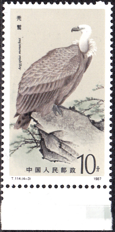Hier eine Marke aus der Volksrepublik China (MiNr 2107) mit einem Schneegeier (Gyps himalayensis) im Markenbild. Der auf der Marke angegebene Tiername ist allerdings falsch.