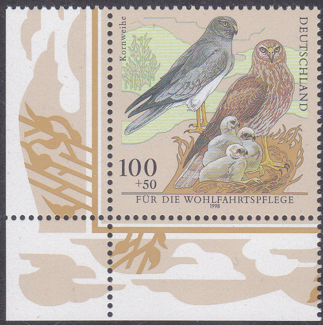 Eine der Wohlfahrtsmarken 1998 der Deutsche Post (MiNr 2015) zeigt ein Männchen und ein Weibchen mit Nest und drei Küken.