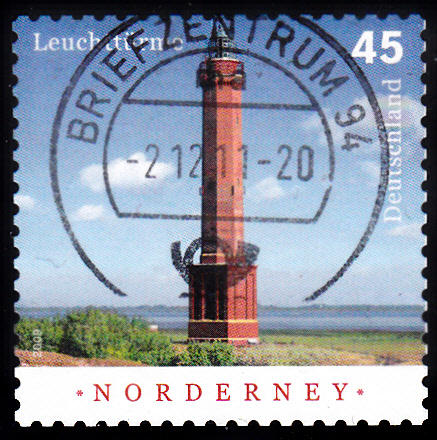 2011 erschien bei der Deutschen Post AG die selbstklebende Version der bereits 2009 ausgegebene Marke mit dem Leuchtturm Norderney in einem Markenheftchen und als Einzelmarke aus Folienbogen. Hier ein gestempeltes Exemplar.