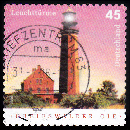 Die bei der Deutschen Post 2004 erschienen Marke mit dem Leuchtturm "Greifswalder Oie" (MiNr 2409) erschien ein Jahr später in der hier gezeigte selbstklebenden Version (MiNr 2478 b) im Markenheftchen (MiNr MH 58)