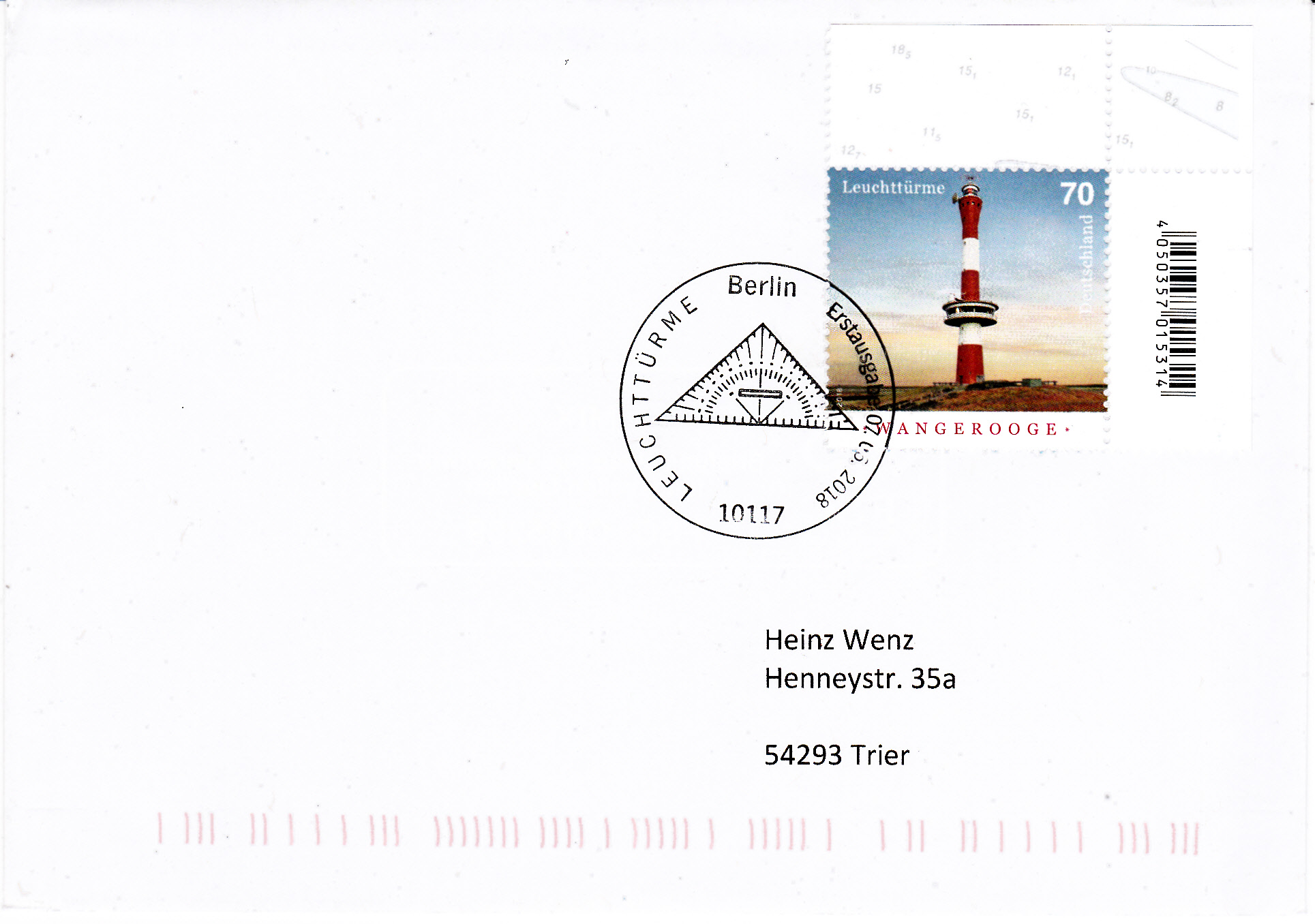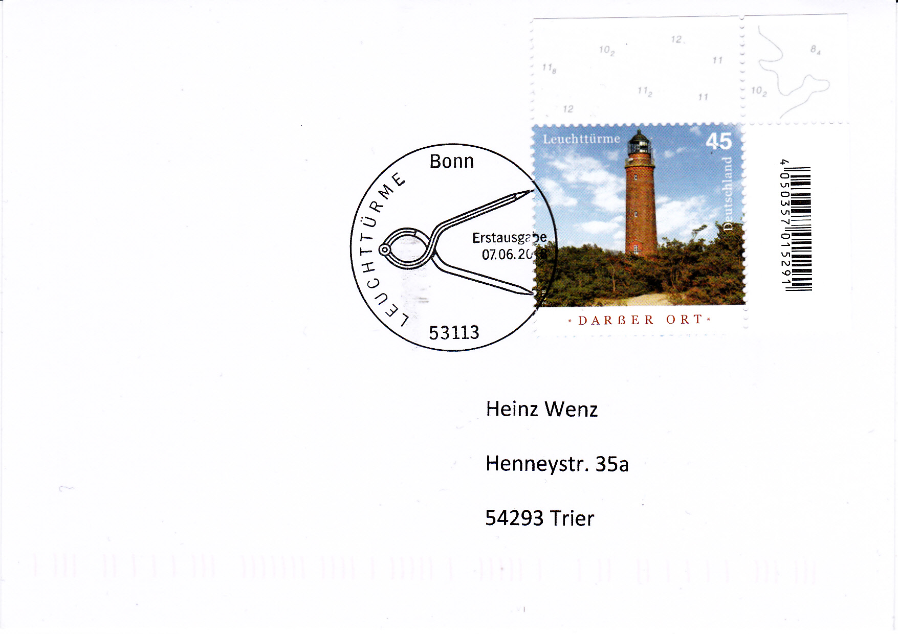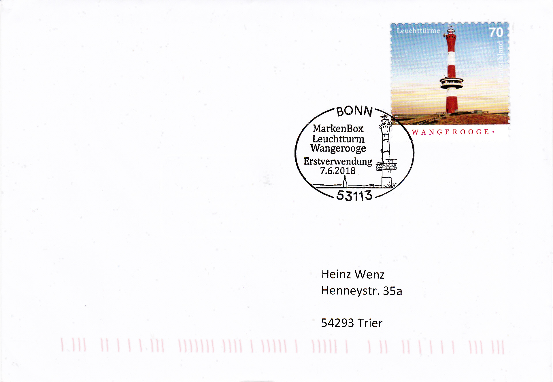 Für die beiden Leuchtturmmarken der Deutschen Post vom 7.6.2018 gab es wie üblich auch Ersttagsonderstempel. Hier die Marke mit dem Leuchtturm Darßer Ort und dem Stempel aus Bonn.