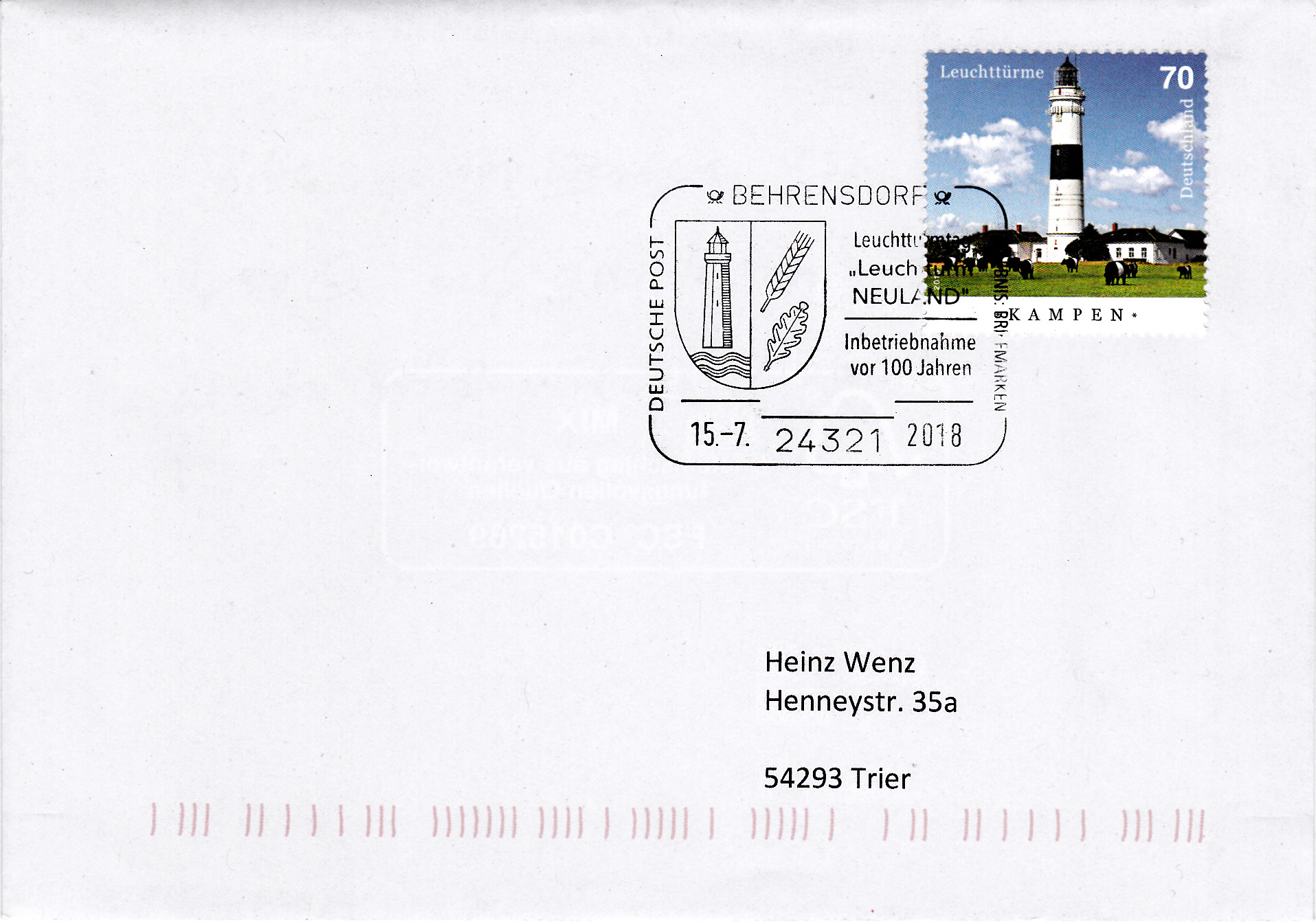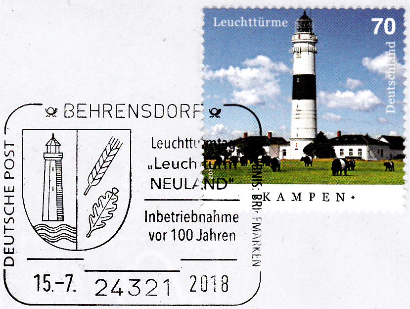 Sonderstempel aus Behrensdorf vom 15.7.2018 zum Leuchtturmtag "Leuchtturm Neuland" aus Anlass seiner Inbetriebnahme vor 100 Jahren. Im Stempelbild wird das Wappen von Behrensdorf mit dem Leuchtturm Neuland gezeigt.