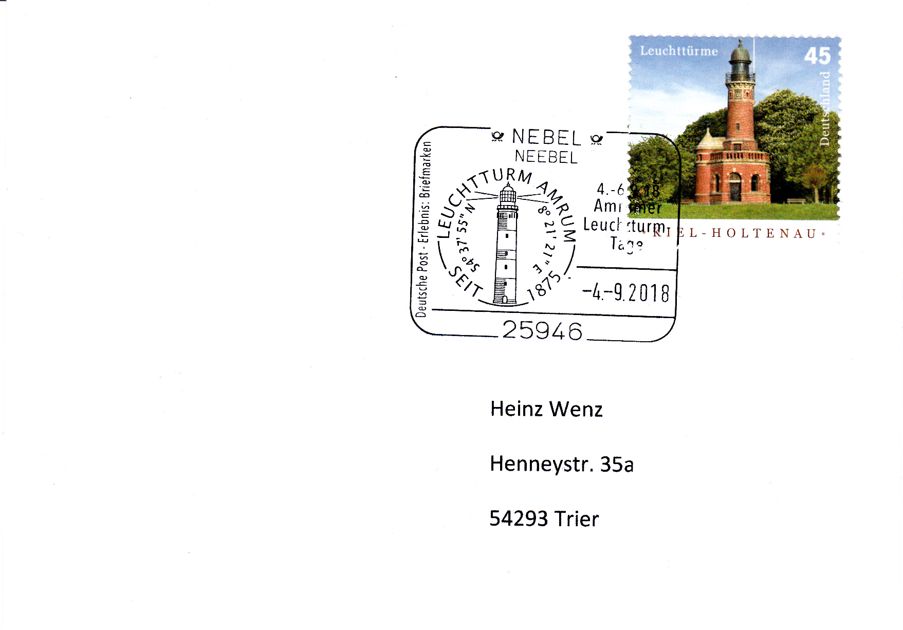Auch zu den Amrumer Leuchtturmtagen vom 4.-6.9.2018 wurde in Nebel am 4.9.2018 ein Sonderstempel eingesetzt. Er zeigt wieder im Stempelbild den Leuchtturm Amrum.
