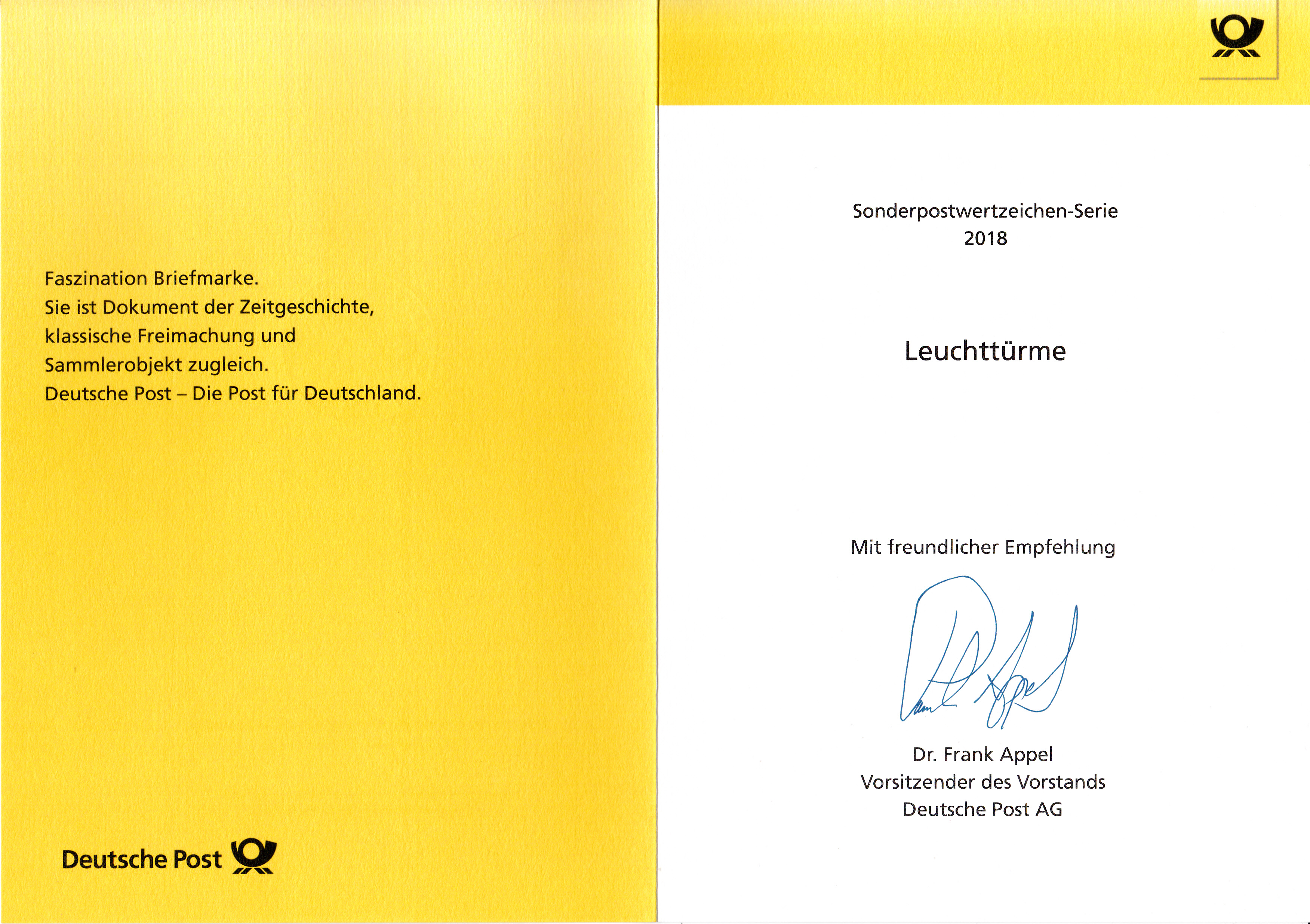 Klappkarte des Vorstandsvorsitzenden der Deutschen Post AG mit den beiden Leuchtturmmarken 2018 und dem Stempel aus Bonn.