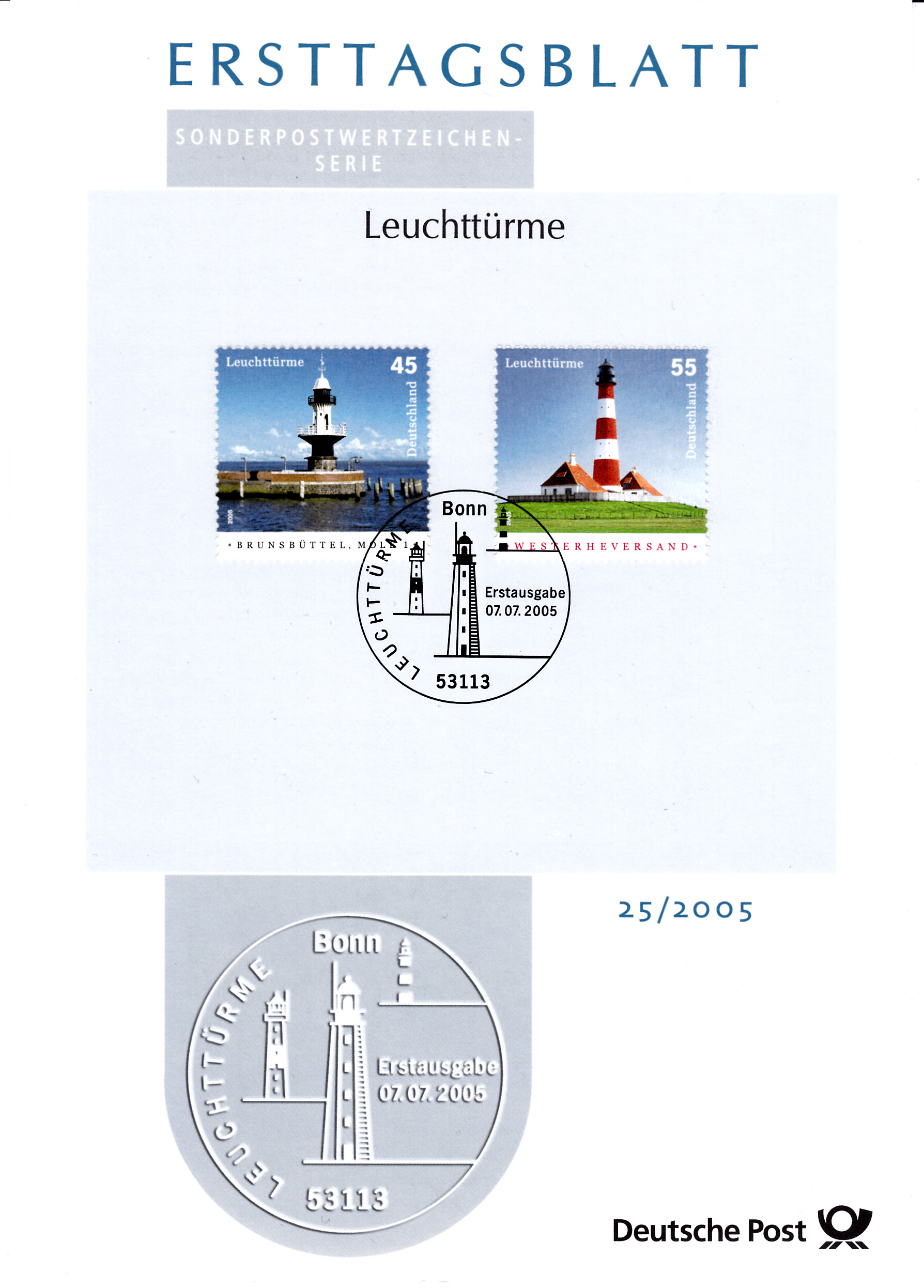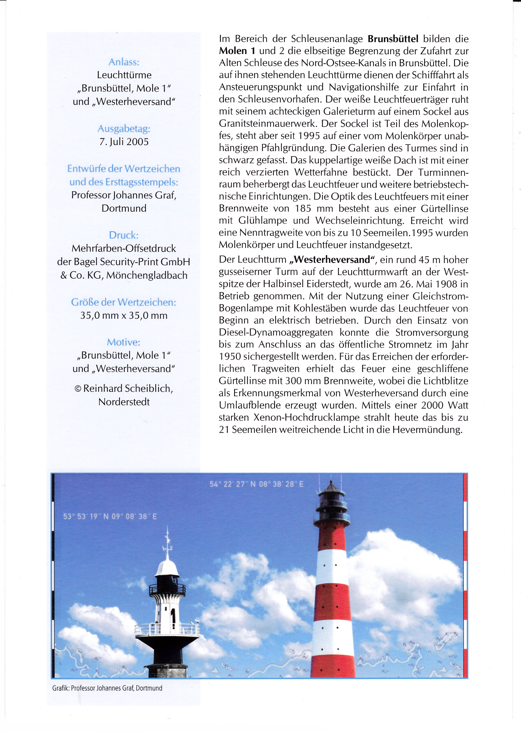 Ersttagsblatt mit den beiden Leuchtturmmarken "Brunsbüttel, Mole 1" und "Westerheversand". Auf der Rückseite kann man ein paar Informationen zu den beiden Leuchttürmen nachlesen.