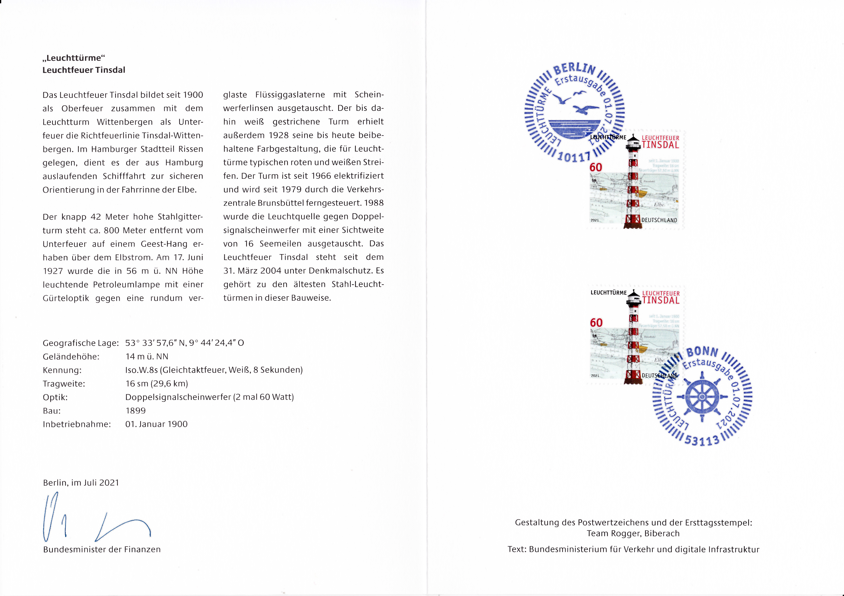 Ministerkarte des Bundesministers für Finanzen mit zwei Marken der Serie "Leuchttürme" der Deutschen Post (MiNr 3615) mit dem Motiv "Leuchtfeuer Tinsdal" und den beiden Ersttagsonderstempel Bonn und Berlin.