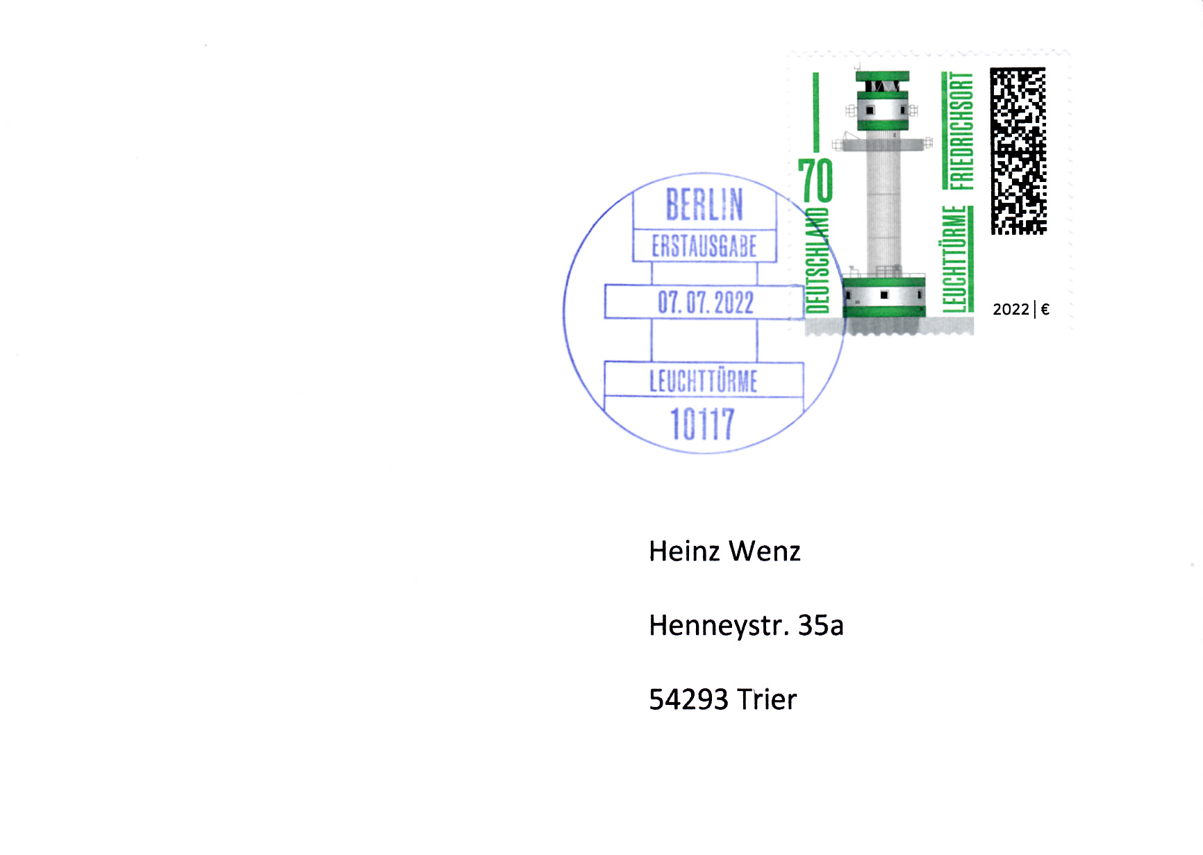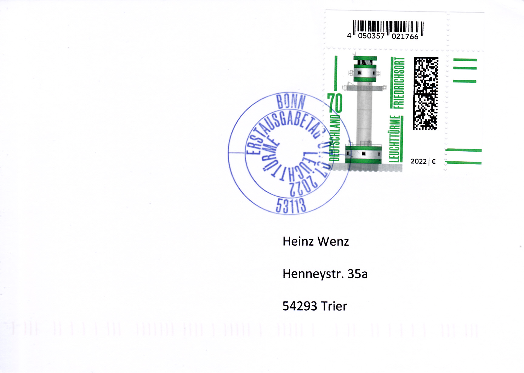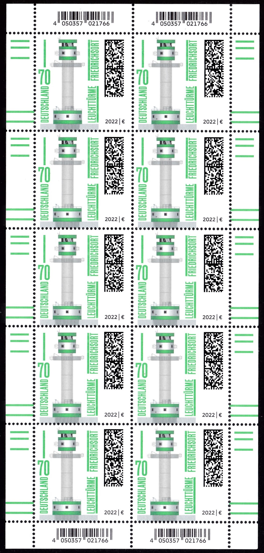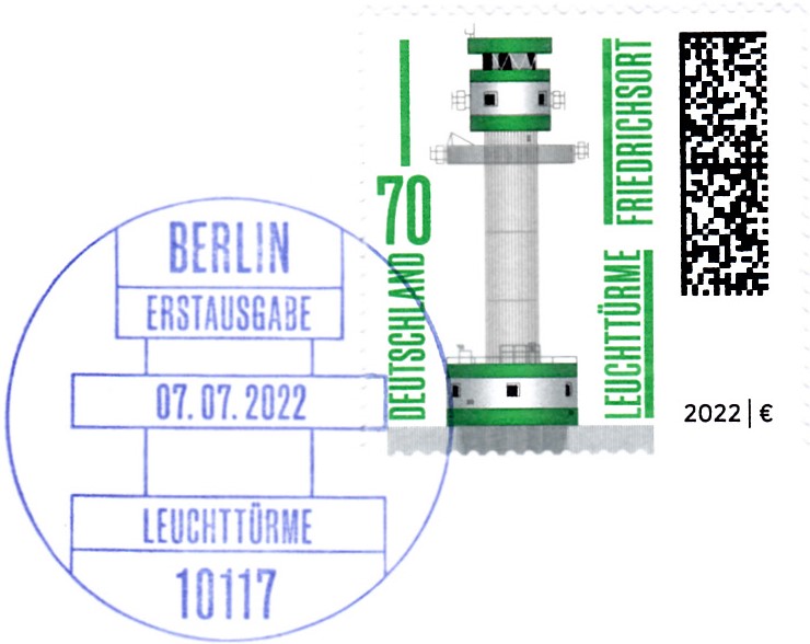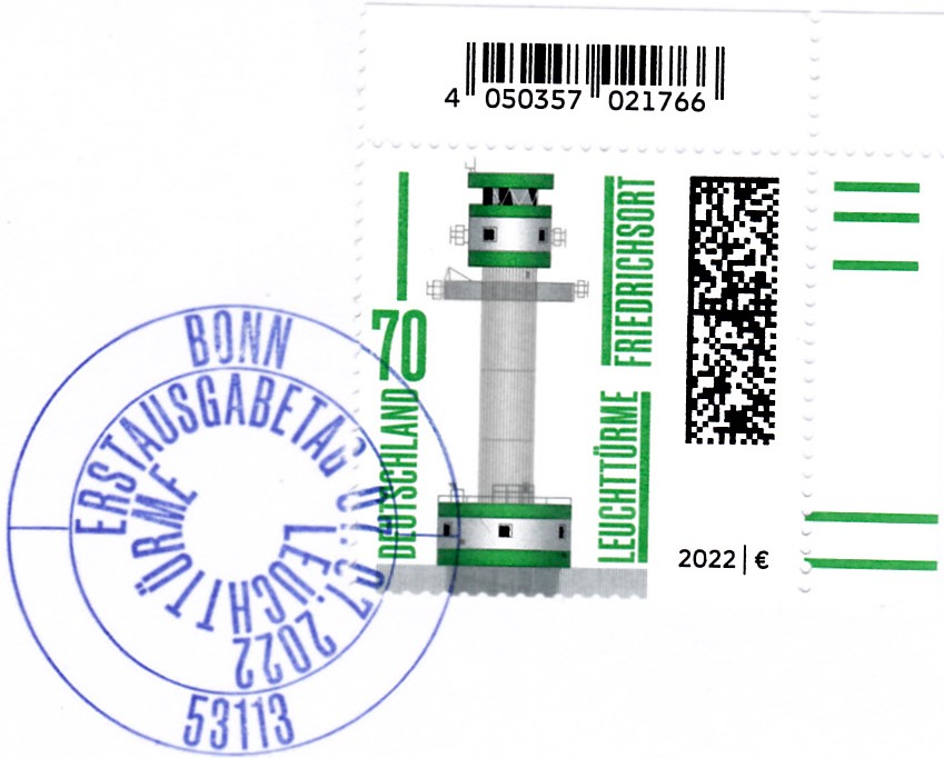 In der Endlos-Serie "Leuchttürme" ist 2022 diese Marke (MiNr 3696) mit einer Darstellung "Leuchtturm Friedrichsort". Diese Marke ist für mich die bisher hässlichste Marke der ganzen Serie.