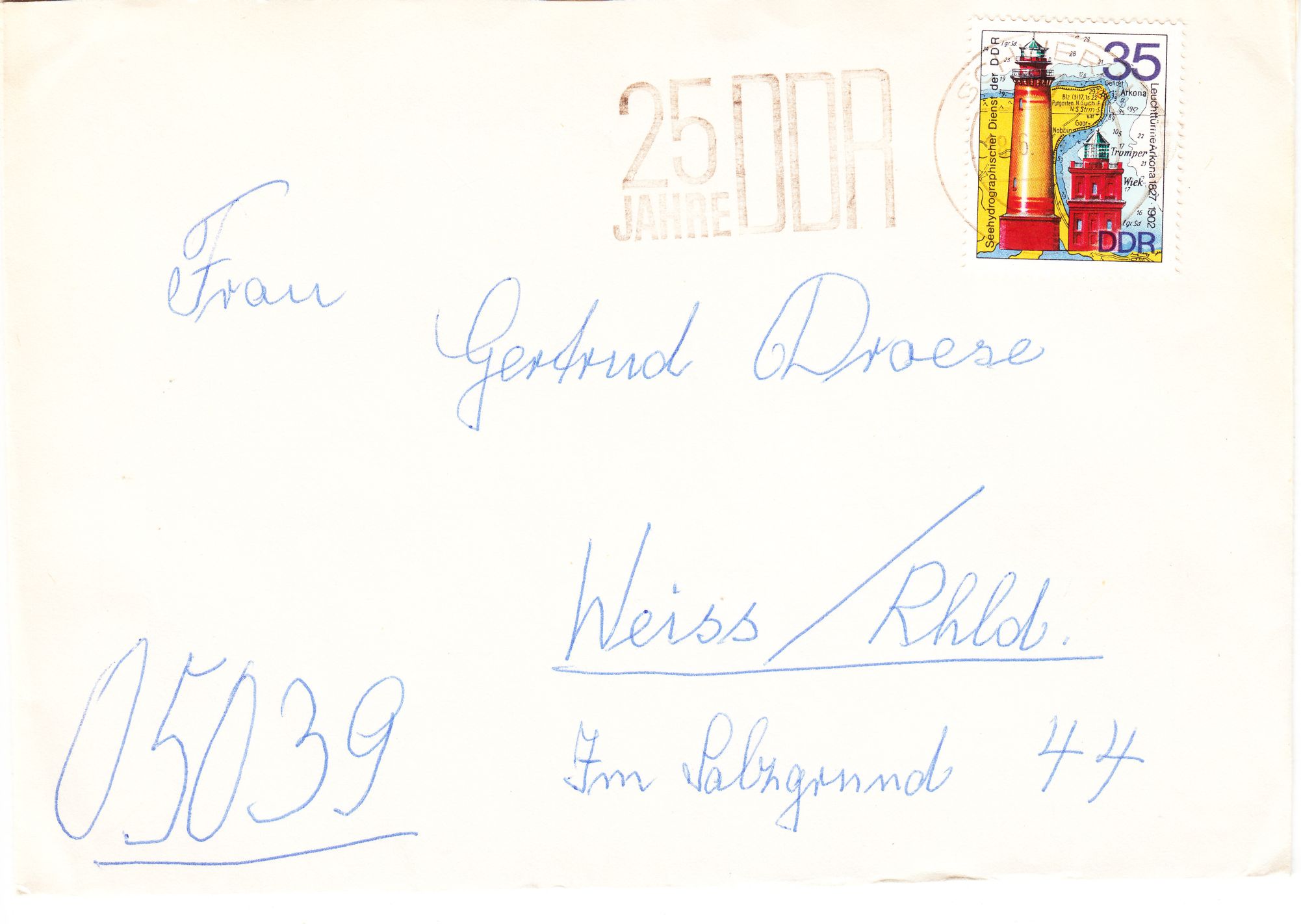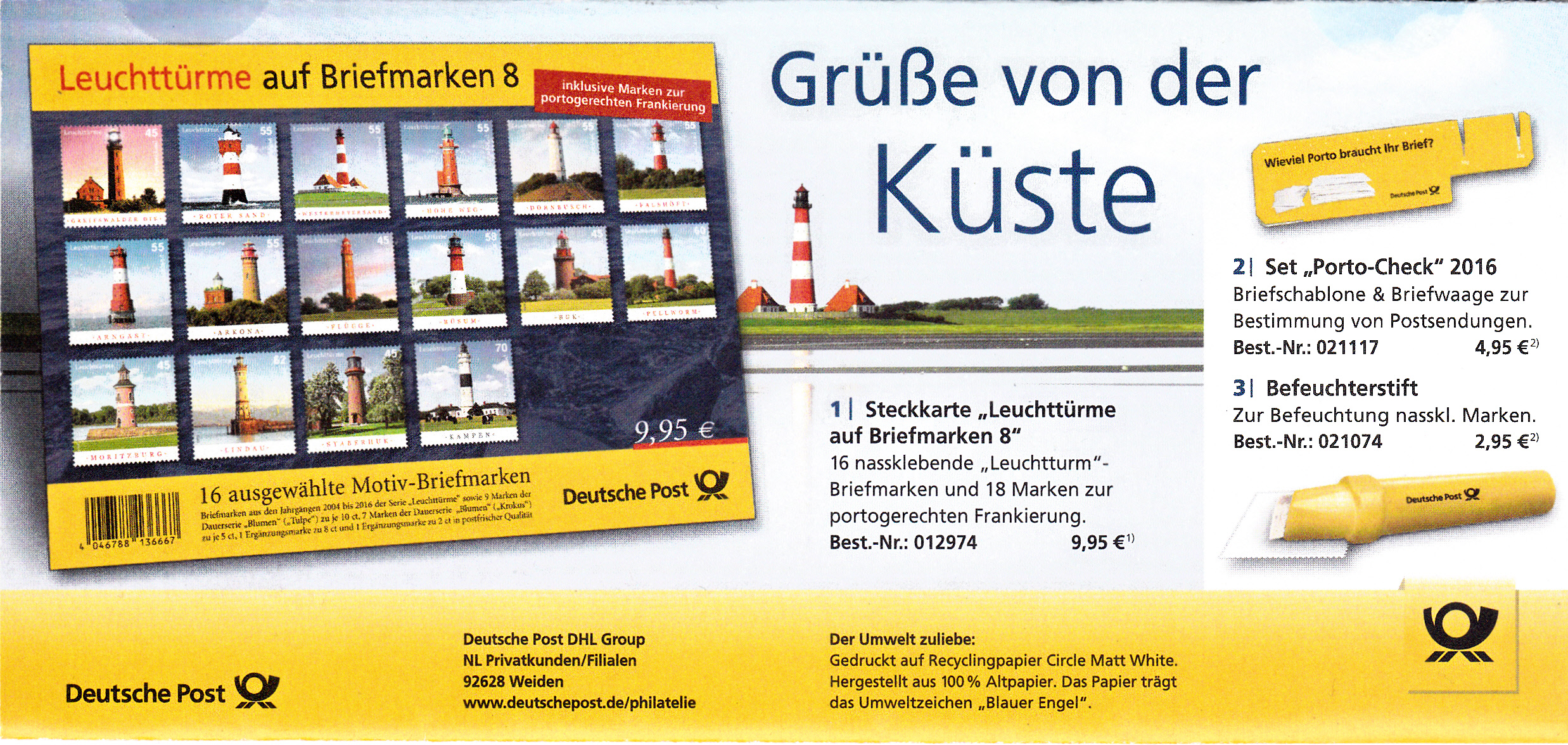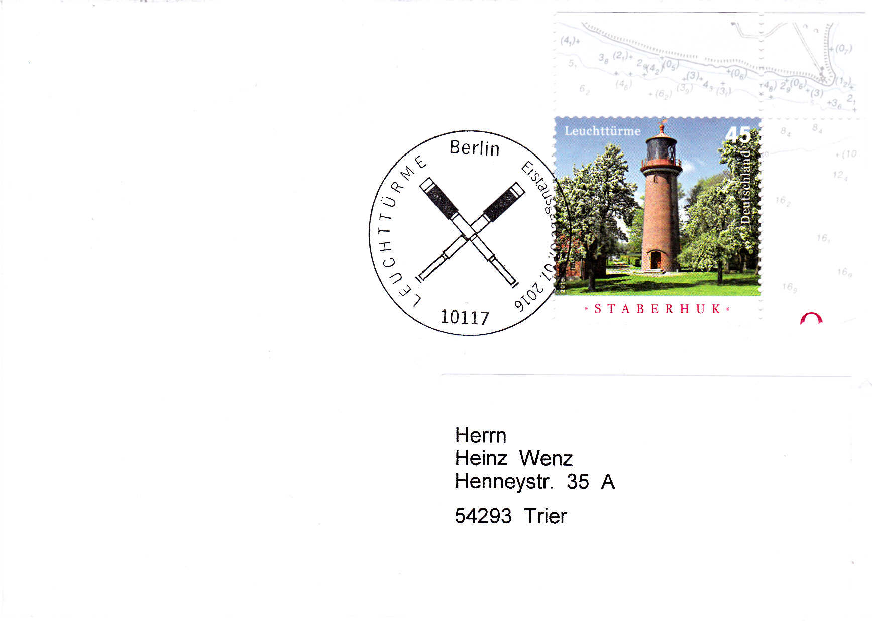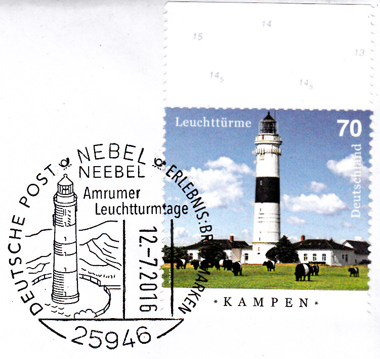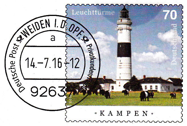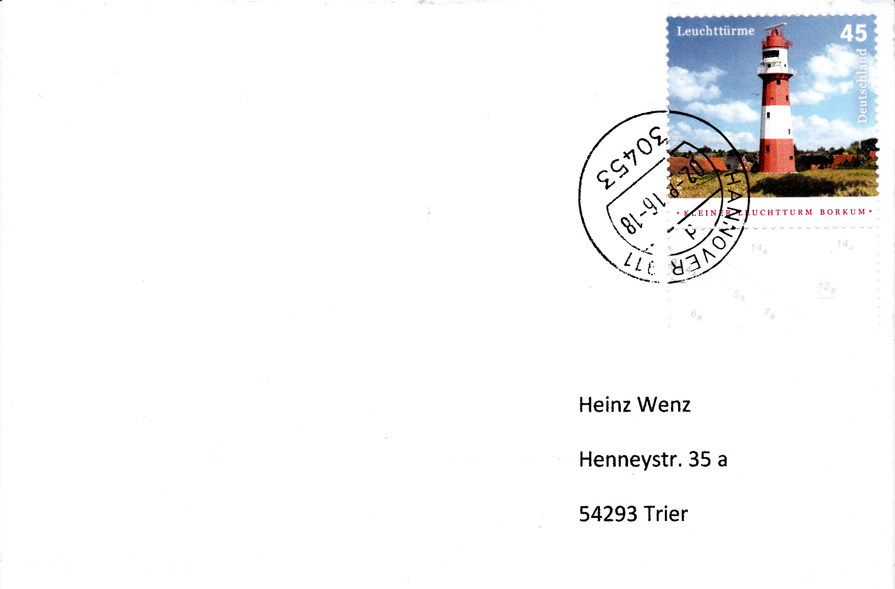 Auf dieser Marke der Deutschen Post (MiNr 2942), die hier zur Frankatur einer Postkarte verwendet wurde, ist der Kleine Leuchtturm Borkum zu sehen.