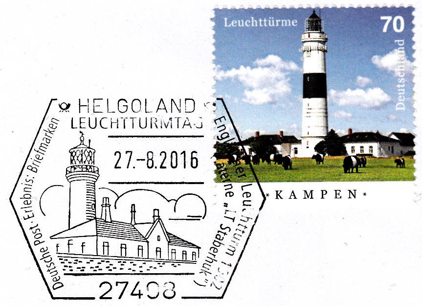 Sonderstempel aus Helgoland vom 27.8.2016 zum Leuchtturmtag mit einer Abbildung des Englischen Leuchtturms mit Nebengebäuden auf Helgoland.